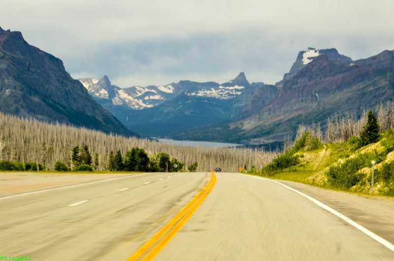 Heute verlassen wir die USA und reisen weiter nach Kanada. Unser Tagesziel lautet Canmore in den kanadischen Rocky Mountains. Entgegen unseren Wettertrends der vergangenen Tage beginnt der heutige Tag mit – Bewölkung! Wir denken ganz kurz: „Was für eine Unverschämtheit“, sind uns aber eigentlich bewusst, dass wir bisher riesiges Glück hatten. Nach dem Packen und schnellen Auschecken fahren wir erneut Richtung Glacier National Park, lassen aber den Eingang links liegen. Ein letzter Blick auf den Park zeigt uns nochmals, welches Wetterglück wir am Vortag hatten. Heute verschwinden die Berge zum Teil in den Wolken.