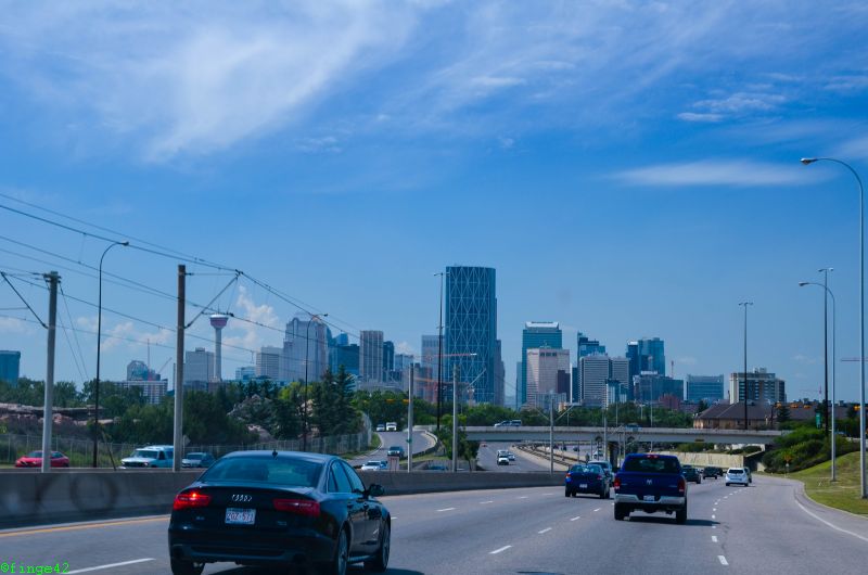 Die nordamerikanische Freundlichkeit setzt sich auch in Kanada fort, im Subway werden die Frauen sofort ein bisschen ausgefragt. Allerdings stellen die Kanadier eine Frage, die uns in den USA niemals begegnet ist, nämlich ob wir in den Ferien sind oder einwandern wollen. Wir sind zunächst sehr überrascht, aber die Frage ist freundlich ernst gemeint. Wir verneinen die Einwanderungsabsicht und schon geht es weiter. Die Fahrt ist relativ langweilig und wir sind froh, als wir gegen Mittag Calgary erreichen. Die Stadt macht einen freundlichen Eindruck und die Sonne scheint auch wieder für uns.