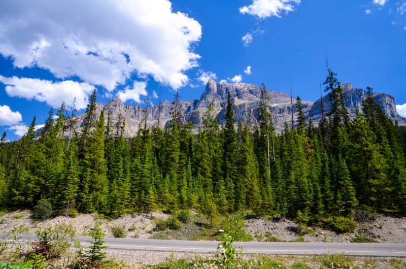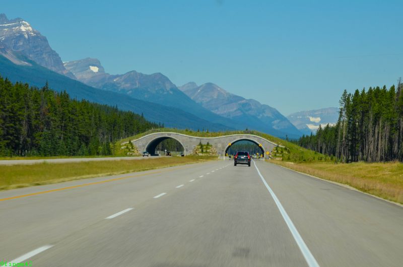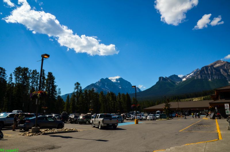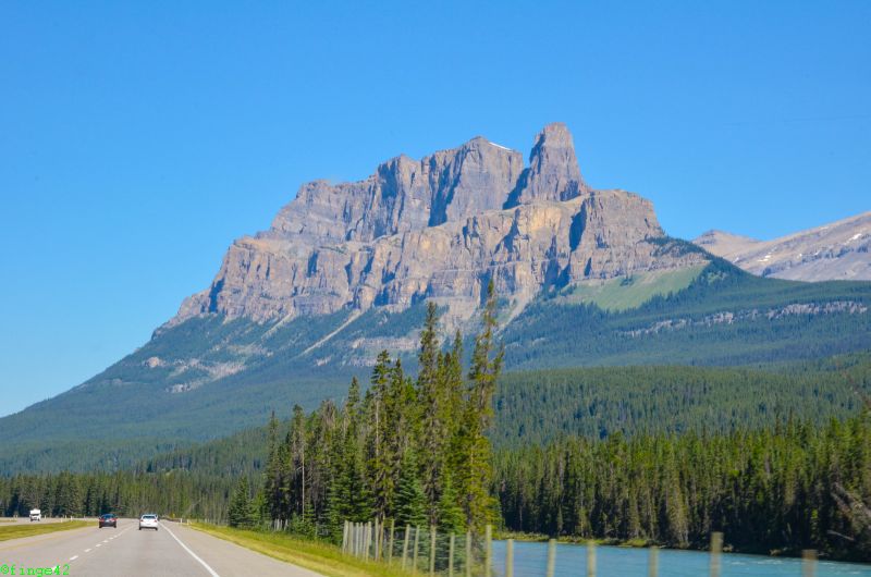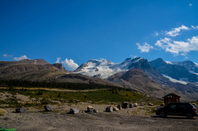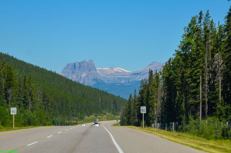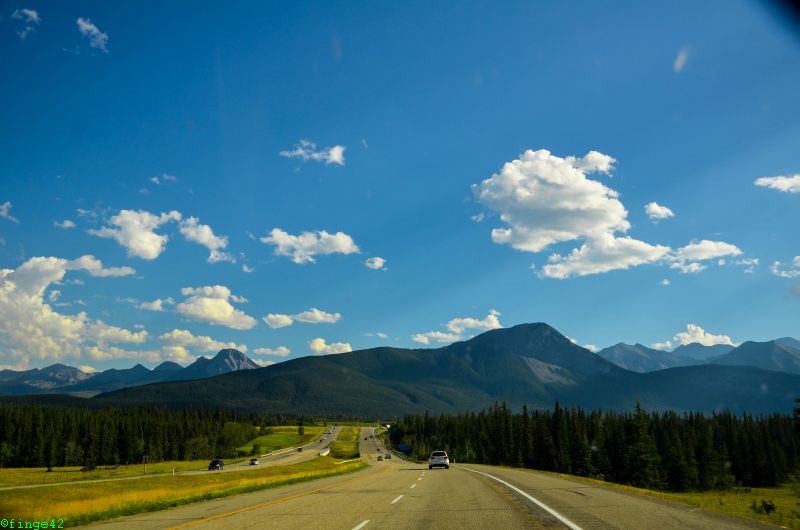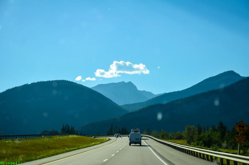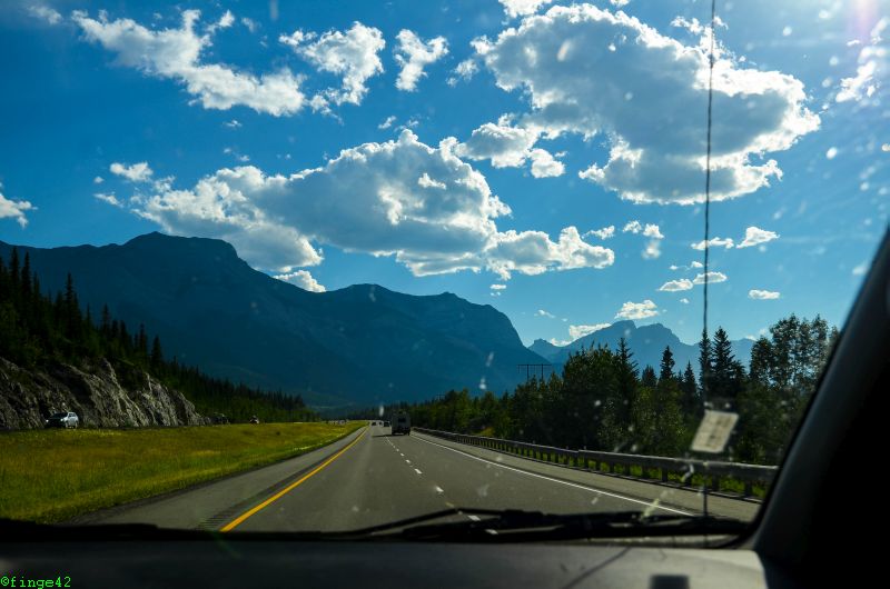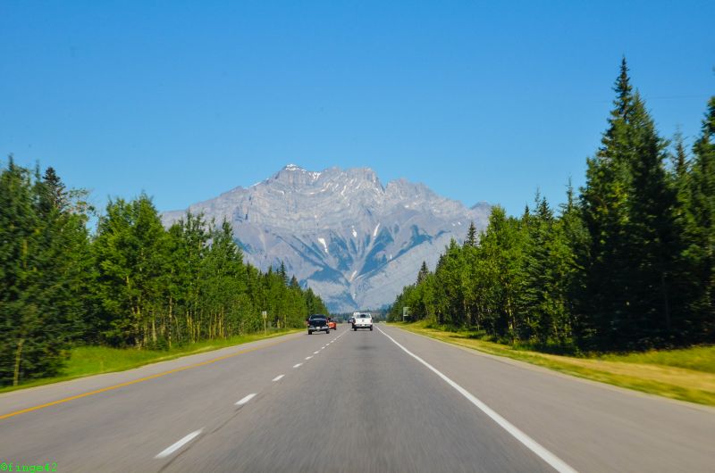 Schon bald begrüßen uns die Berge ganz nah, das Wetter ist mal wieder überragend. Am Eingang zum Banff Nationalpark (mitten auf dem Trans-Canada Highway) kann man entweder durchfahren, oder einen Nationalparkpass kaufen. Wir tun Letzteres. Es handelt sich dabei um einen Pappanhänger für den Spiegel. Dann geht es recht schnell weiter. Kurz hinter Lake Louise verlassen wir den Trans-Canada Highway und biegen auf den Icefields Parkway ab.