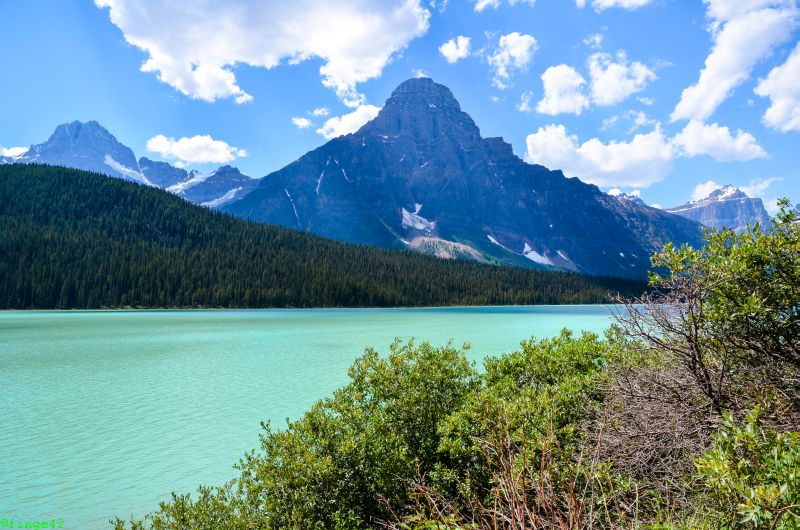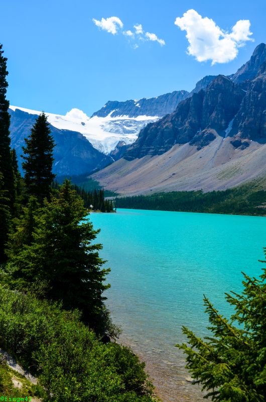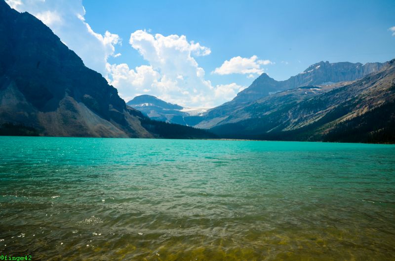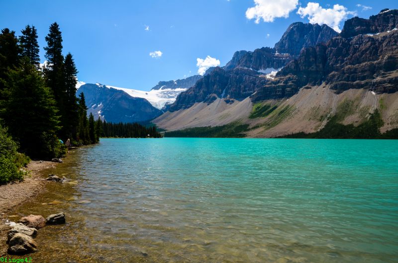 Nächster Halt ist Bow Lake, der das typische milchige Blau der kanadischen Bergseen zeigt. Auch hier herrscht ziemliche Ruhe, obwohl der See recht nah an der Straße liegt.