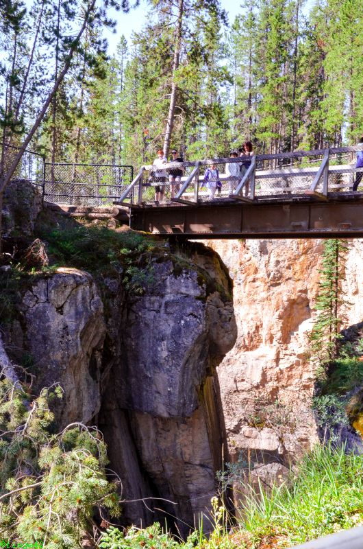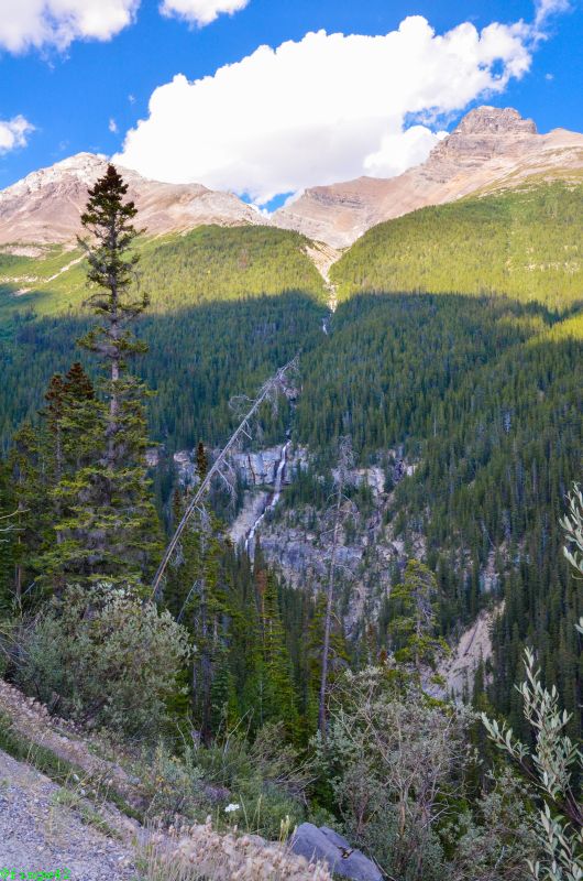 Der weitere Weg führt uns durch eine großartige Bergkulisse. Rechts und links der Straße gibt es immer wieder Wasser in verschiedensten Farben. Das einzige, das wir nicht sehen sind: größere Tiere. Vögel und Hörnchen gibt es immer wieder, aber keine Hirsche und erst recht keine Bären. Es ist einfach viel zu warm, alle verstecken sich tief im Wald. Am Mistaya Falls Trailhead müssen wir den Eingang zum Trail erst kurz suchen. Der Weg ist aber sehr schön und endet an den Falls, die sich durch kleinere Schluchten zwängen.
