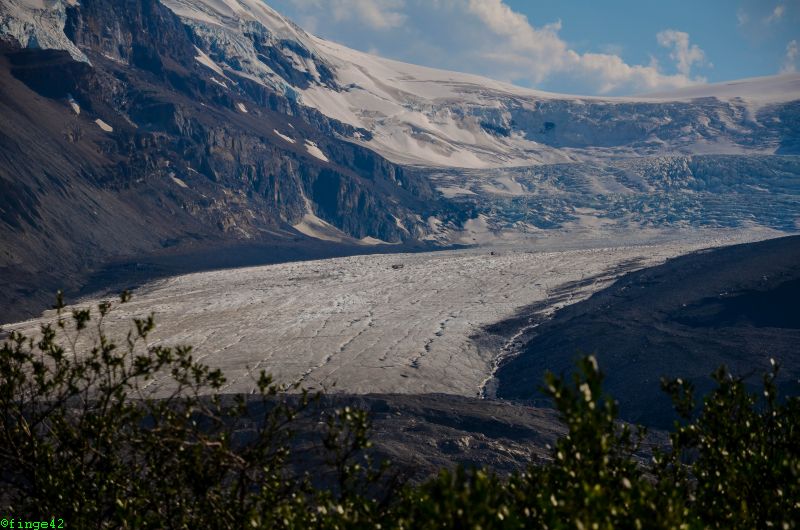 Kurz hinter dem Pass erreichen wir das Icefields Center am Athabasca Glacier. Wir könnten hier eine Fahrt mit einem umgebauten Bus auf den Gletscher machen, hatten uns aber schon im Vorfeld dagegen entschieden. Der Parkplatz am Center (rechts von der Straße) ist total voll. Wir fahren etwas weiter und biegen dann links Richtung Gletscher ab. Es gibt eine Straße, die uns zu einem Parkplatz ganz nah am Gletscherfuß führt. Hier stehen zwar einige Autos, aber wir finden sofort einen Parkplatz. Danach nehmen wir den kurzen aber steilen Weg bergauf und erreichen schon bald die Schmelzwasserflüsse und den dahinterliegenden Gletscherfuß.