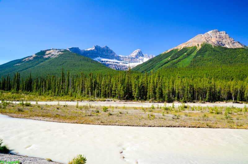 Der Sunwapta River fließt rechts neben uns, mal ganz nah, mal in einem weiten Flussbett, das viel mehr Wasser aufnehmen könnte und im Frühling wahrscheinlich auch muss.