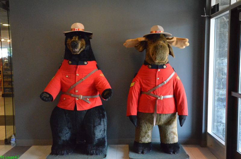 Dann erreichen wir erneut das Icefields Center. Heute wollen wir das Center von innen anschauen. Es ist proppenvoll und überall sind elend lange Schlangen. Im Shop kostet ein Magnum Eis schlappe 6 CAD und wir haben keinen Hunger mehr. Stattdessen posieren wir zusammen mit zwei netten Mounties!