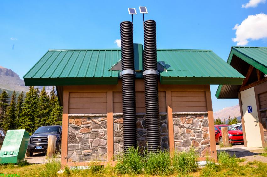 Schließlich erreichen wir erneut den Bow Lake. Zunächst fahren wir zur Lodge am See (Num-Ti-Jah-Lodge), um uns ein bisschen umzusehen. Die Lodge scheint schon älter und gut besucht zu sein. Die Toilettenhäuschen dagegen sehen sehr viel neuer, aber weniger einladend aus.