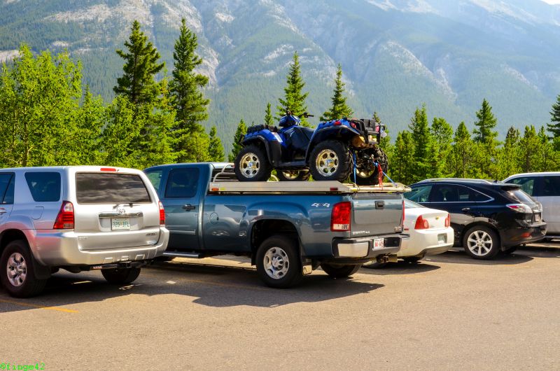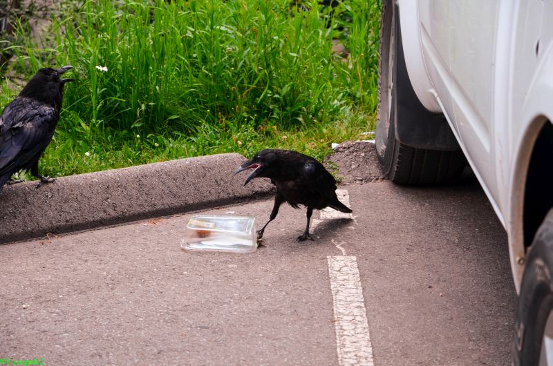 Danach geht es los zum Moraine Lake. Der Parkplatz ist schon ziemlich voll, wir quetschen uns aber noch in eine Lücke. Dann hören wir einen lautstarken Streit – mehrere Raben haben in einem offenen Pickup eine Kunststoffverpackung mit Essensresten gefunden. Jeder Rabe darf sich daran versuchen, die Packung zu öffnen, es klappt aber nicht sehr gut.