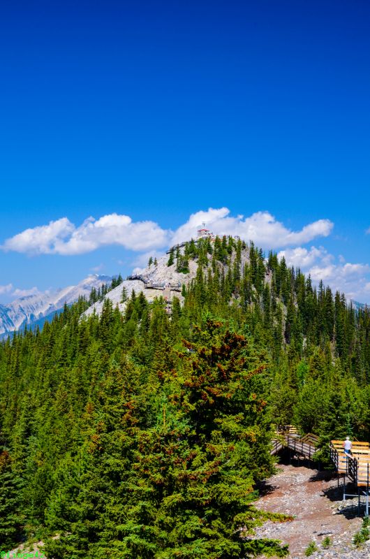Oben angekommen umrunden wir das Restaurant mit Shop und laufen dann noch etwas mehr als 1 Kilometer bis zur Cosmic Ray Station National Historic Site of Canada. Sowohl vom Weg aus als auch vom „Gipfel“ bewundern wir die umliegenden Berge und die Stadt.