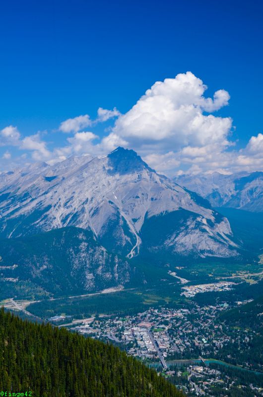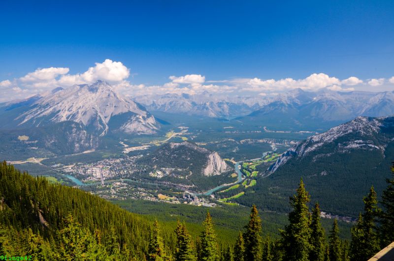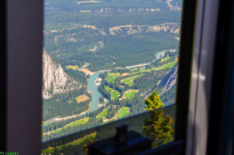 Nach einem erneut ausgiebigen Frühstück meint Frank, er müsse mal dringend das Auto waschen lassen. Tatsächlich gibt es eine Waschanlage in Canmore und das Auto strahlt nach der Wäsche wie neu. Danach fahren wir das kurze Stück bis zur Banff Gondola. Wir wollen mit der Gondel auf den Sulphur Mountain fahren und von dort zur Fuß zurück zum Parkplatz. Diese Art des Besuchs ist die Teuerste. Würden wir es umgekehrt machen, kostete die Gondelfahrt nur die Hälfte, aber wir trauen uns nicht, die 5,5 km bergauf zu laufen. Der Ticketkauf geht recht schnell, es ist auch gar nicht so voll, so dass wir nach wenigen Minuten in der Gondel sitzen. Die Fahrt dauert etwa 8 Minuten und wir haben bereits unterwegs eine wunderbare Sicht auf Banff und die umliegenden Berge.