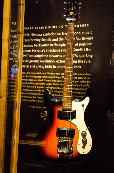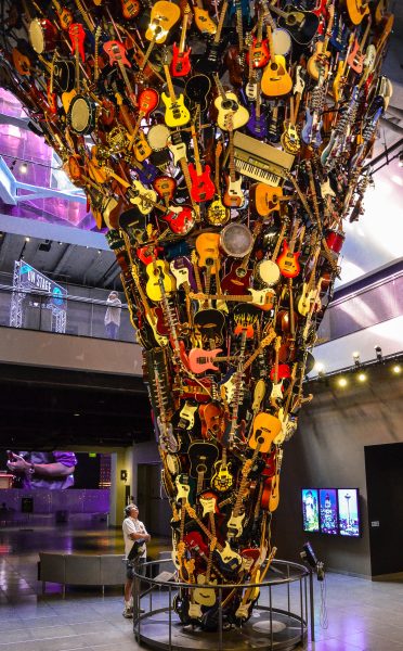 Wir können uns vom Ausblick kaum trennen, aber wir haben noch einiges vor, also geht es weiter zum EMP Museum (Experience Music Project). Gegründet wurde das Museum von Paul Allen, es befindet sich in Sichtweite der Bill und Melinda Gates Stiftung. Der Bau sieht von außen ziemlich avantgardistisch aus und soll einer geschmolzenen E-Gitarre nachempfunden sein. Im Museum werden die großen Musiker der Stadt geehrt (z.B Jimi Hendricks und Nirvana). Man kann auch Instrumente spielen und seine eigene Musik aufnehmen, Sarah spielt ein bisschen auf der Gitarre, während wir die Ausstellungen mit vielen Fotos und Berichten genießen.