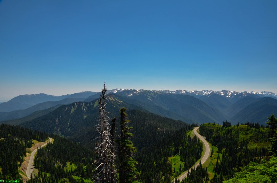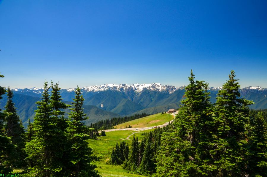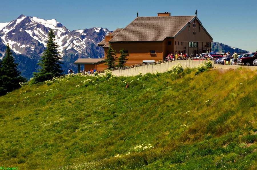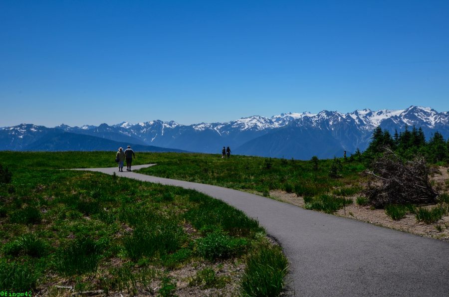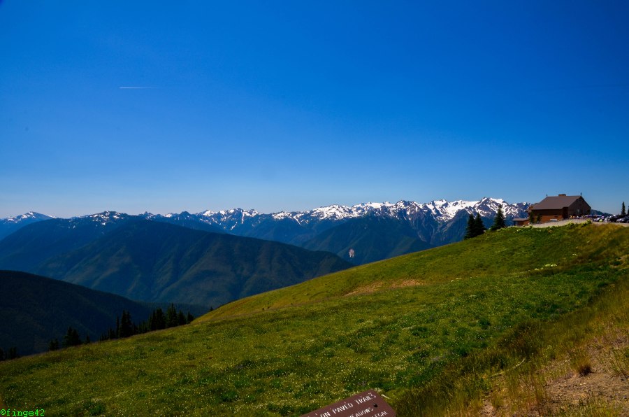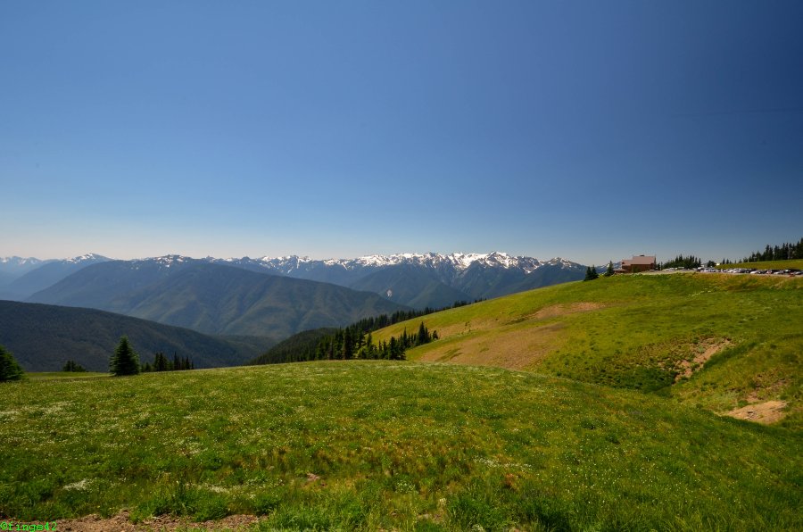 Endlich erreichen wir den Parkeingang und kaufen uns einen Annual Pass. Weiter geht es Richtung Hurricane Ridge hoch in die Berge. Das Visitor Center liegt in etwa 1600 m Höhe, das merken wir schon und schnaufen etwas. Aber der freie Blick auf die Berge der Umgebung entschädigt sofort. Wir können etwa 80 km weit sehen.