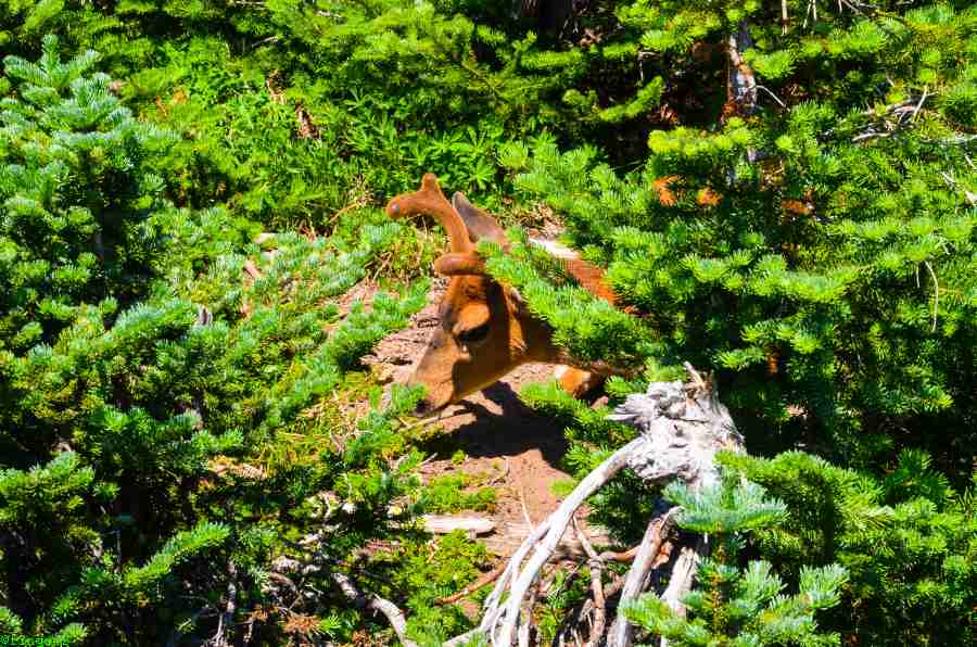 Auf dem kurzen Weg zum Sunrise Point wissen wir gar nicht, wo wir zuerst hinschauen sollen. In der Ferne die Berge, ganz nah am Weg die Hirsche.
