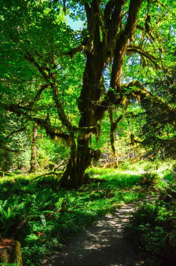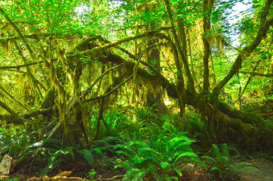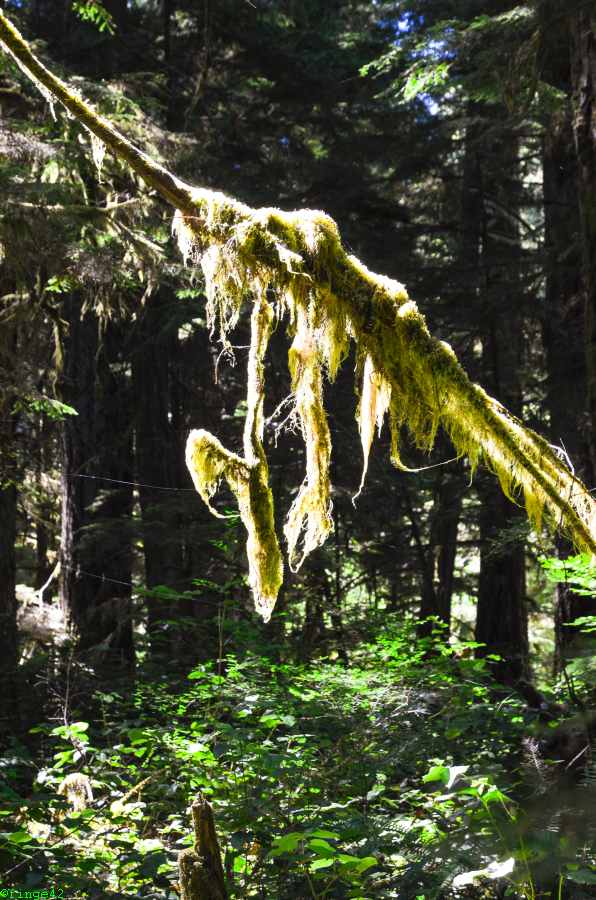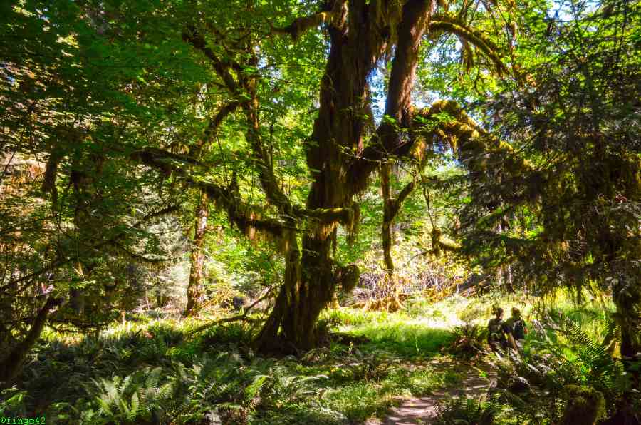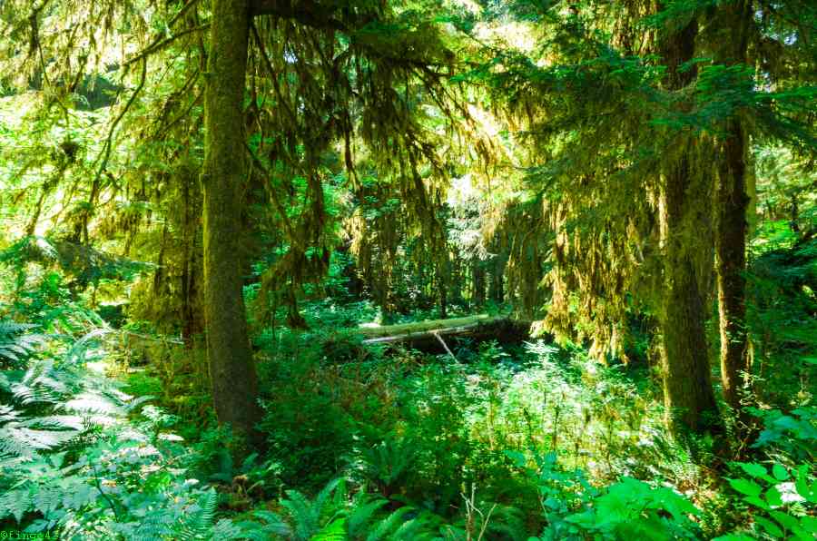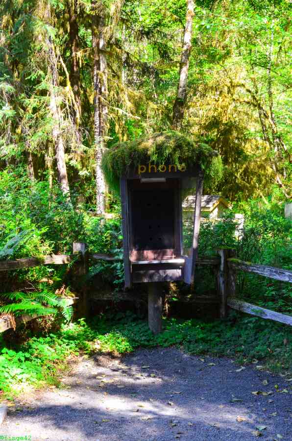 Nach einem kurzen Frühstück auf dem Zimmer verlassen wir Forks und fahren Richtung Hoh Rain Forest. Die Sonne wärmt schon wieder und vertreibt die letzten Nebelfetzen. Tatsächlich weist uns ein Schild auf dem Weg zum Regenwald auf moderate Waldbrandgefahr hin. Wir stellen das Auto am Visitor Center ab, besprühen uns kurz mit Bug-Spray und begeben uns auf den Hall of Mosses Trail, einen Rundweg.