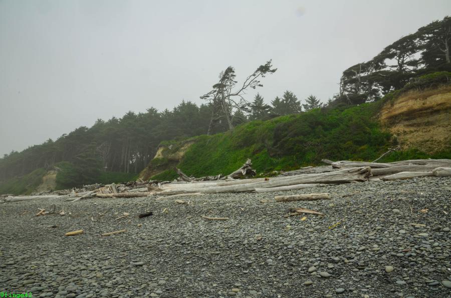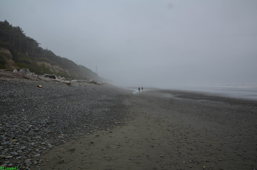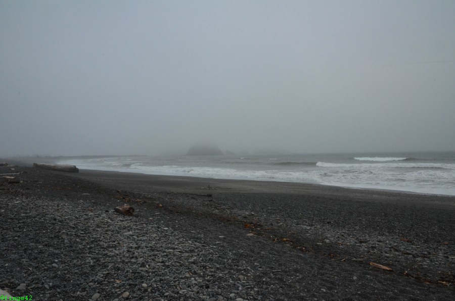 Gut gesättigt werden wir übermütig und fahren die recht kurze Strecke zum Rialto Beach am Pazifik. Wir sind gut informiert und erwarten einiges zu sehen. Aber je näher wir dem Wasser kommen, desto wolkiger wird es. Direkt am Strand ist es ungefähr so schön, wie Allerheiligen bei 5 Grad und Regen auf dem Friedhof. Uns umgibt Nebel und grauer Nieselregen. Wir frieren und sehen leider gar nichts von den erwarteten Felsen im Meer. Das Meer mag uns offensichtlich nicht. :(