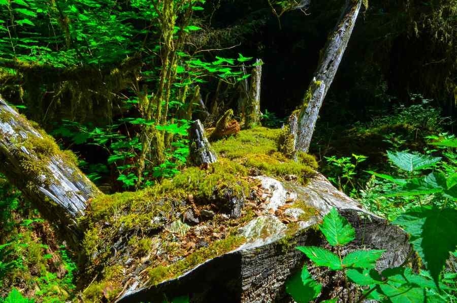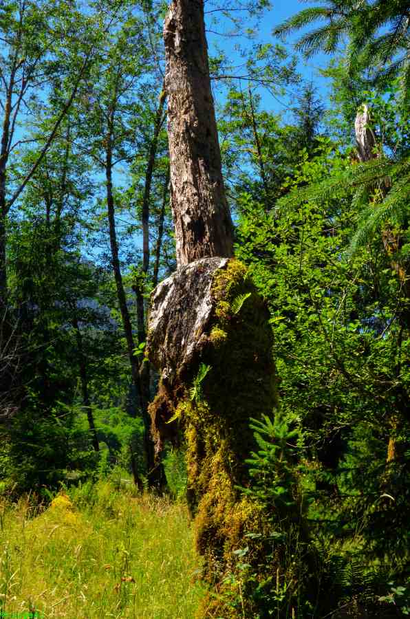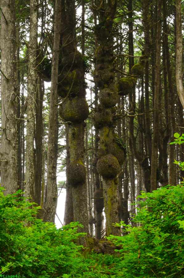 Also klettern wir über das Treibholz zurück zur Straße. Dabei kommen wir noch durch einen Fichtenwald mit seltsamen Baumstämmen (Spruce Burls).