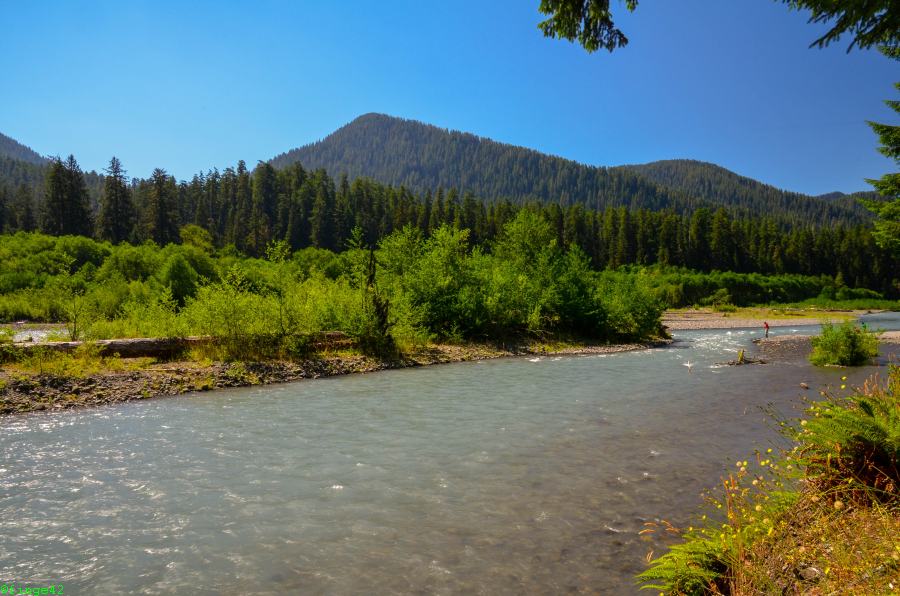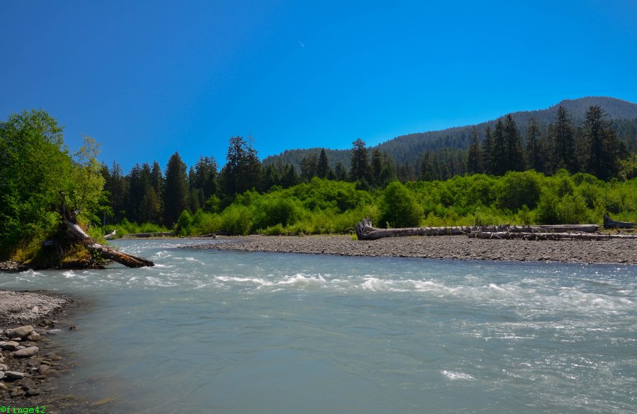 Schließlich erreichen wir das Ufer des Hoh River und halten für ein paar Fotos kurz an.