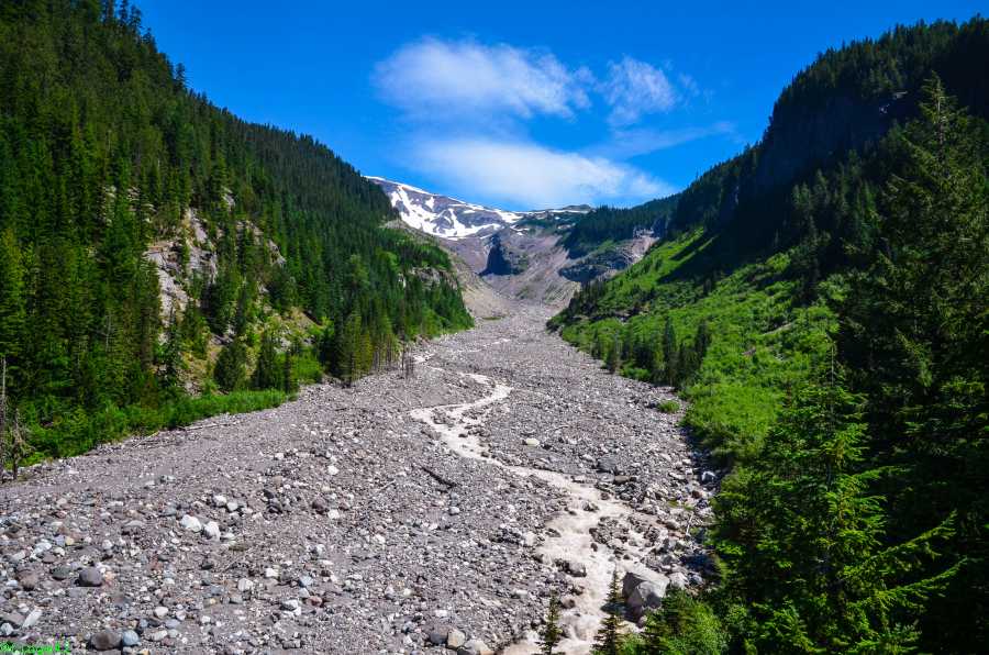Das ist nicht verwunderlich, schließlich ist er hoch genug (4392 m). Je näher wir kommen, umso beeindruckender wird der Blick auf den Berg. In der Nähe gibt es keinen anderen größeren Berg, Mount Rainier ist vulkanischen Ursprungs.