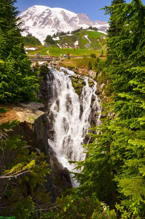Nach einer Ehrenrunde finden wir einen Parkplatz in der Nähe des Visitor Centers in Paradise. Wir haben schon wieder Hunger und gönnen uns einen kleinen Snack aus der Kühlbox, den wir direkt am Auto verdrücken. Dann begeben wir uns auf den Skyline Trail zu den Myrtle Falls.
