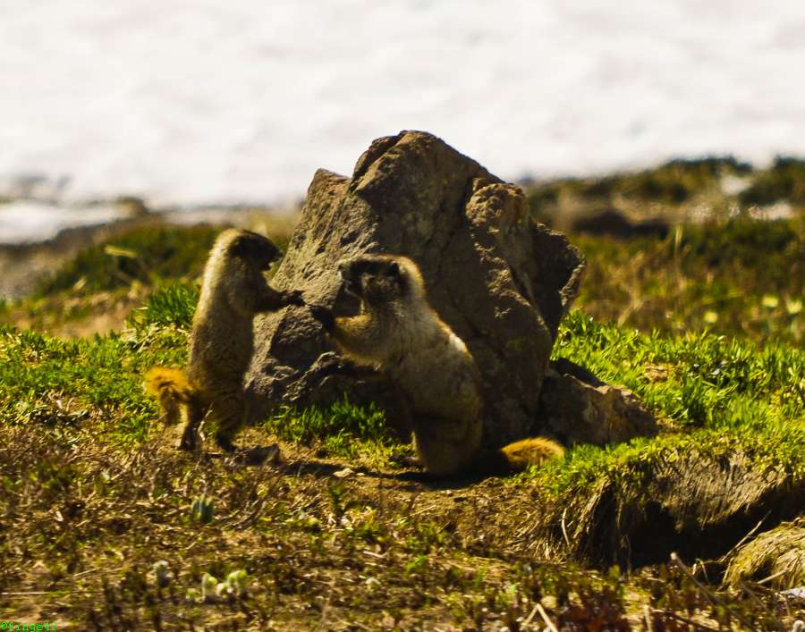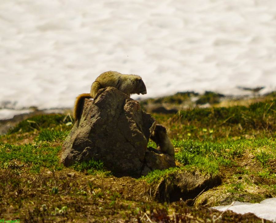 Da wir zuvor nur sehr kurz in einer Höhe über 1500 m unterwegs waren, fällt uns der Aufstieg nicht ganz leicht. Bis zu den Falls sind noch recht viele Menschen unterwegs, danach nicht mehr, da der Weg immer wieder von Schneefeldern überdeckt wird. Wir wollen aber noch ein bisschen höher gehen. Auf dem Schnee zu laufen ist gar nicht so leicht, aber man darf ja den Weg nicht verlassen, es sind irgendwie immer Ranger da, die einen sehr bestimmt daran erinnern. Trotzdem haben wir sehr viel Spaß, da wir immer wieder spielende Murmeltiere beobachten können.