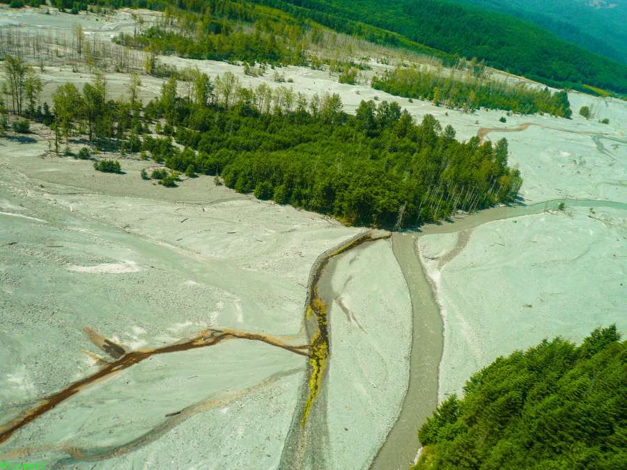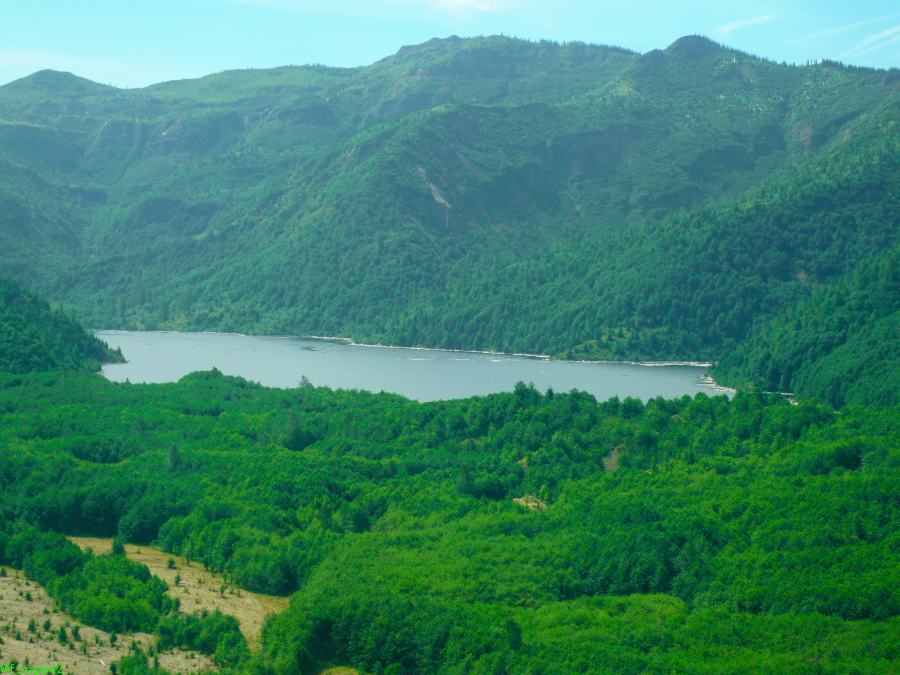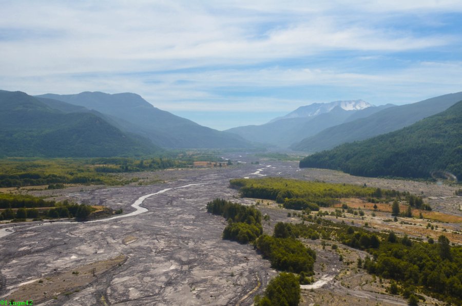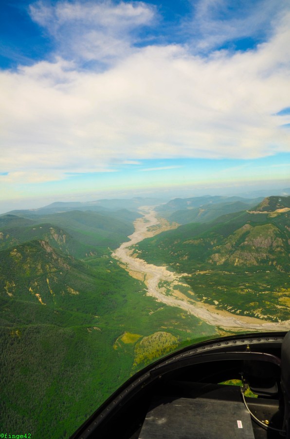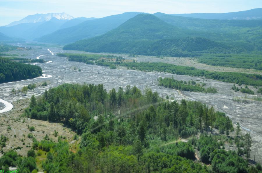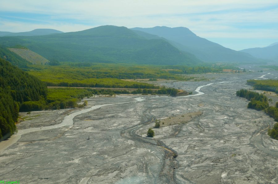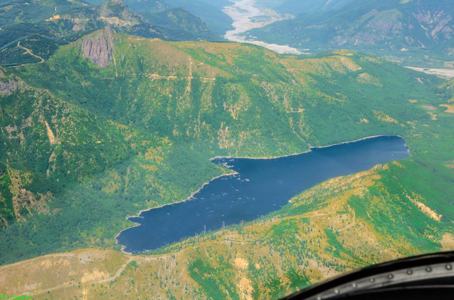 Außerdem kann man Spirit Lake gut erkennen, einen großen See, der übersät ist mit den Stämmen der beim Vulkanausbruch entwurzelten Bäume. Die Stämme treiben, je nach Wind und Wetter, auf dem See hin und her, man weiß nie, an welchem Ufer sie sich gerade befinden, erklärt der Pilot.