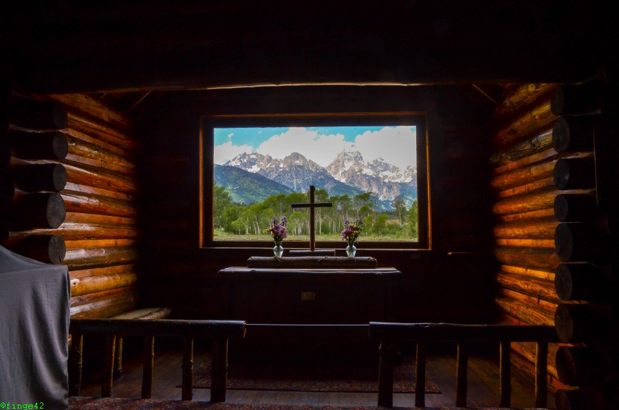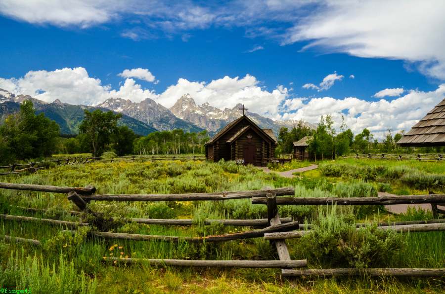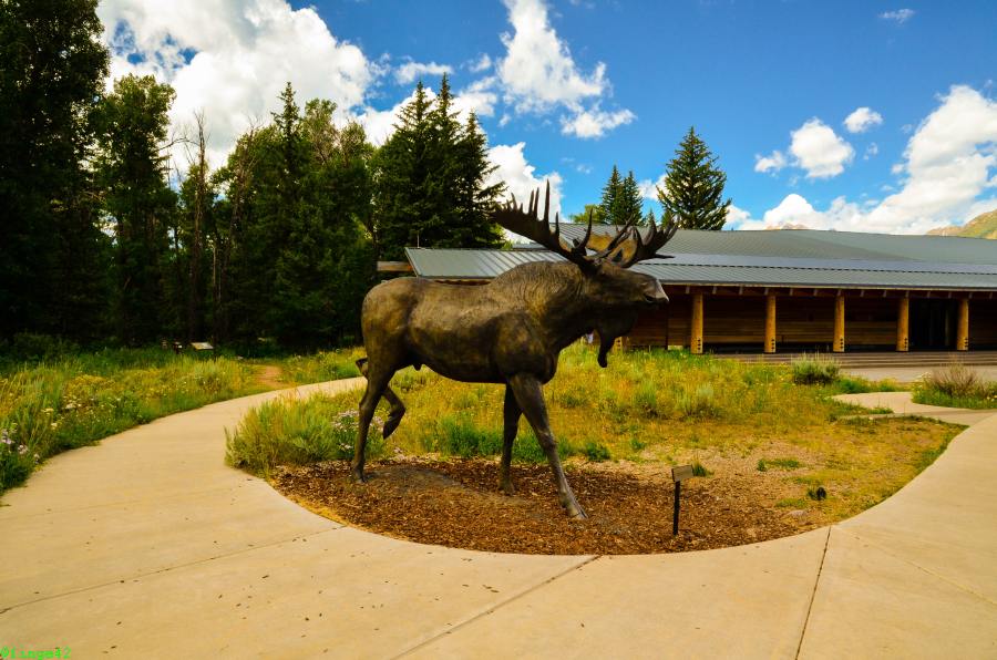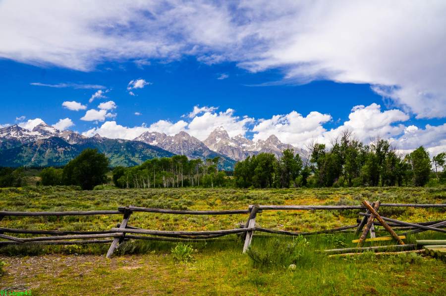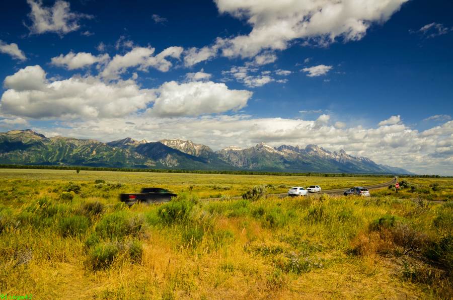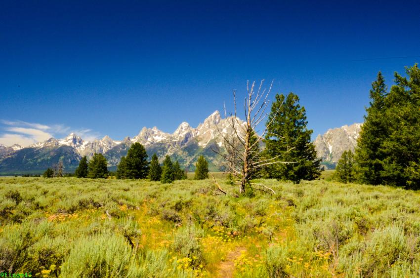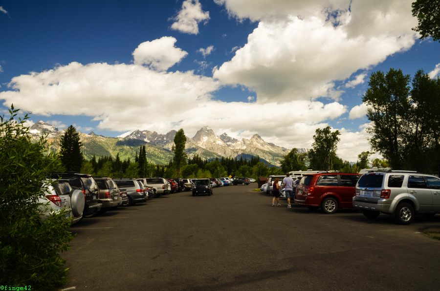Natürlich müssen wir auf dem Weg noch einige Fotostopps einlegen. Als erstes halten wir auf besonderen Wunsch von Frank nochmals an der Mormon Row. Da heute ein wolkenloser, sonniger Tag ist, haben wir einen besonders schönen Blick auf die Tetons.