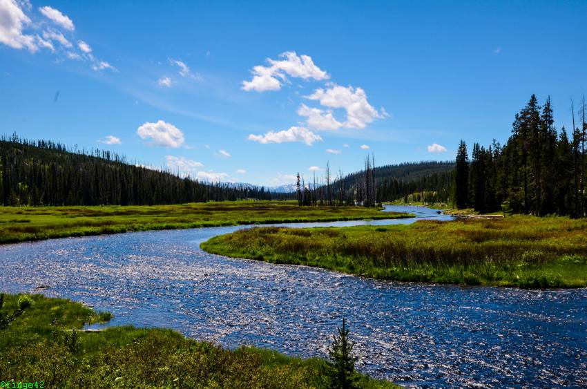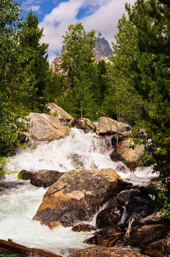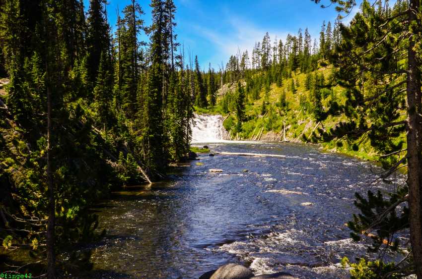 Schließlich lassen wir den Grand Teton National Park hinter uns und überqueren die „Grenze“ zum Yellowstone National Park. Dort warten direkt neben der Straße die Moose Falls auf einen kurzen Besuch.