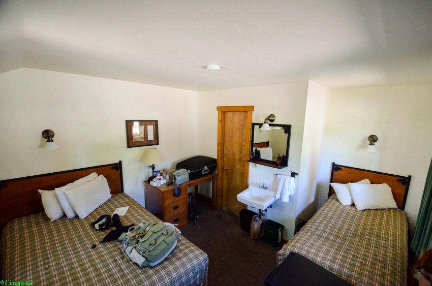 Das Einchecken in der Old Faithful Lodge geht recht schnell und schon stehen wir vor unserer 42-Sterne Unterkunft direkt am Firehole River. Die Tür wird aufgeschlossen und wir trauen uns nicht alle gleichzeitig rein, sonst wäre das Zimmer vielleicht überfüllt. Die 12 qm sind mit Möbeln vollgestellt – wir brauchen ja auch 2 Betten. Darin enthalten ist der 1,5 qm große Wellnesstempel.