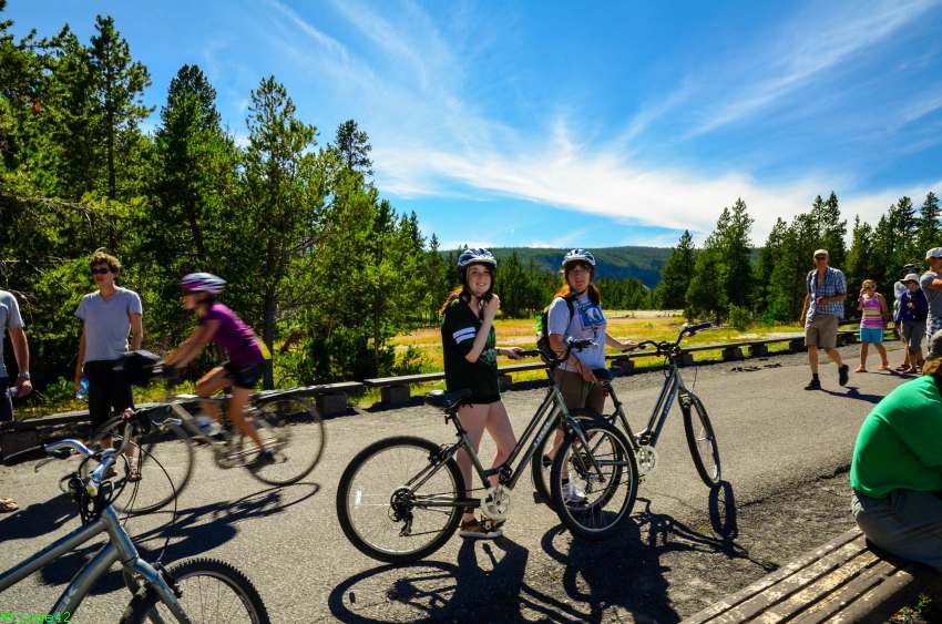 In der Old Faithful Gegend gibt es unglaublich viel zu sehen. Allerdings muss man schon gut zu Fuß sein und einige Zeit mitbringen, sonst sind die Attraktionen zu weit auseinander. Mit Fahrrädern allerdings, lässt sich das alles sehr viel besser erreichen. Wir erhalten Räder mit Fahrradschloss und einer Klingel (gibt es wohl nicht immer in den USA, denn auf dem Weg reagieren nicht alle auf unser Klingeln), Helme und sogar eine Sicherheitseinweisung. Zum Glück konnten wir schon vorher Radfahren. Der nette Verleiher gibt uns sogar noch eine gute Wegbeschreibung und schon geht es los von der South Section zur North Section durch das Upper Geyser Basin.