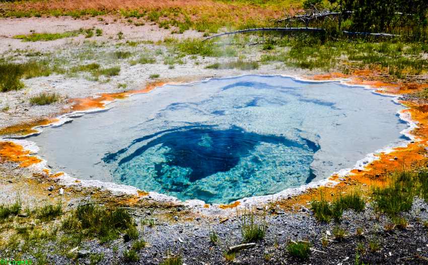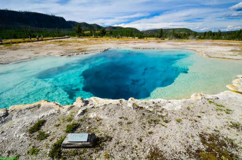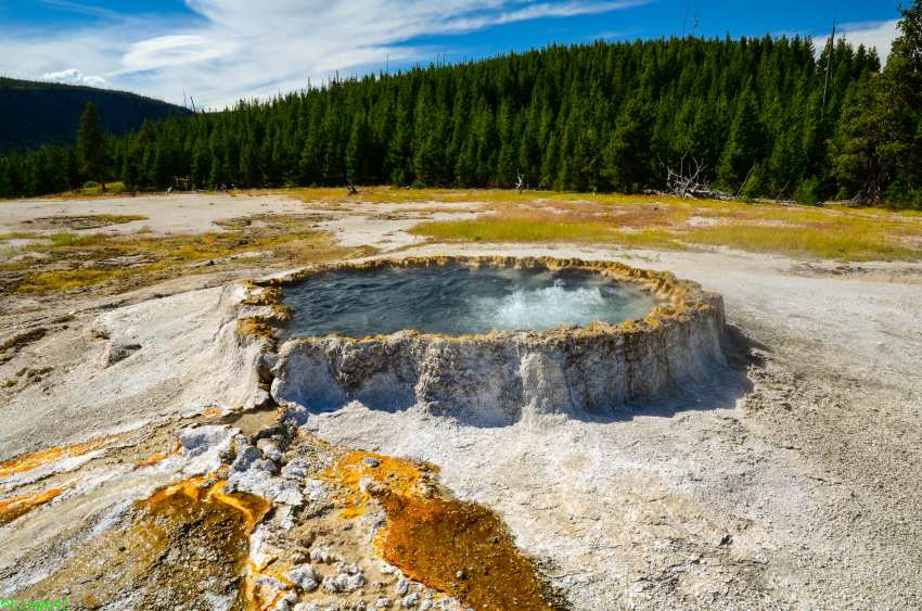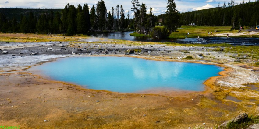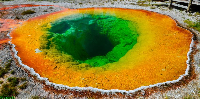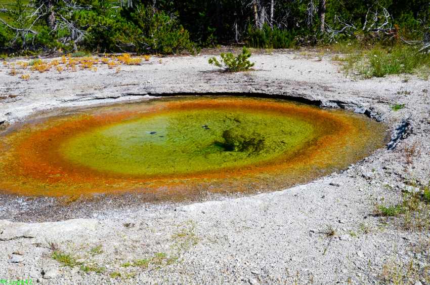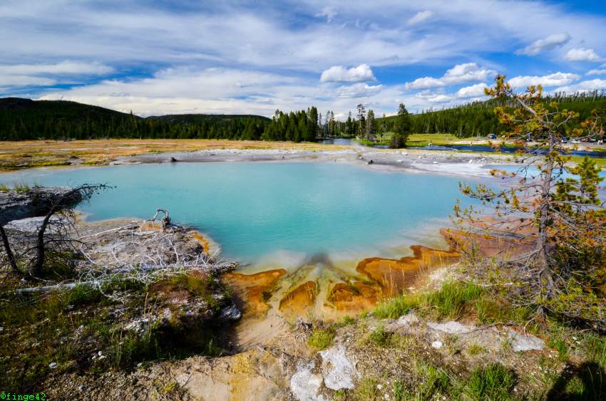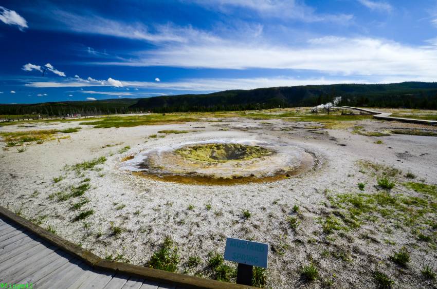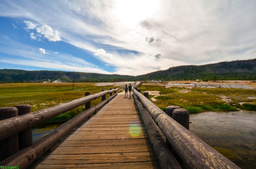 Am Biscuit Basin parken wir unsere Räder und gehen über den Steg an den Pools vorbei. Es stinkt ganz ordentlich, aber auch hier gibt es einiges zu sehen.