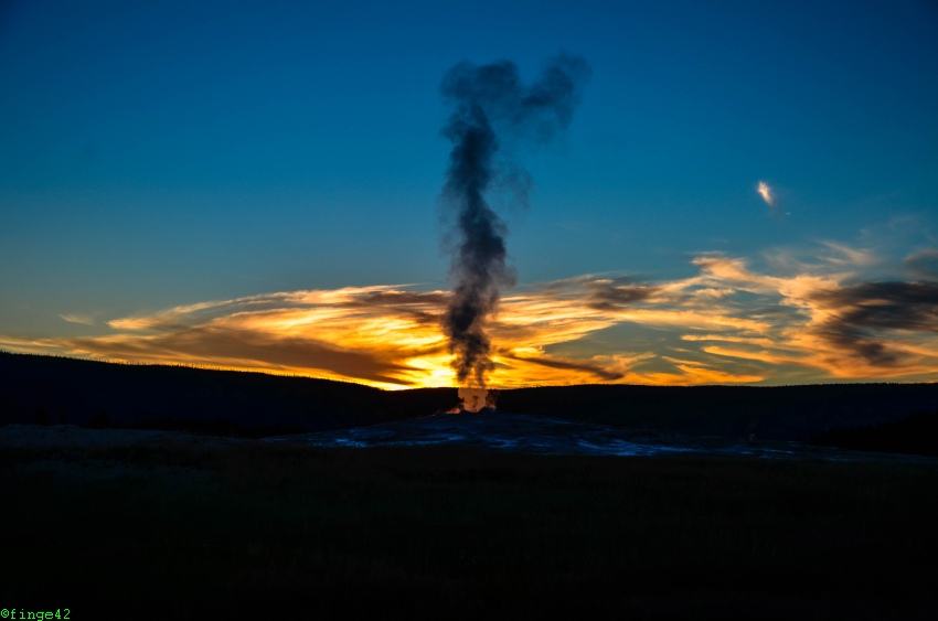 Nach dem Essen fängt es bald an zu dämmern und wir hoffen, dass der Old Faithful ausbricht, bevor es richtig dunkel ist. Es gibt immer nur eine Vorhersage mit einem Zeitfenster von ca. 30 Minuten, in denen der Geysir voraussichtlich ausbricht (ein Ausbruch etwa alle 60 bis 90 Minuten). Wir sitzen also rechtzeitig in der ersten Reihe – es sind kaum noch andere Menschen dort, ganz anders, als am Mittag – und warten. Gut dass wir uns mit Bugspray eingesprüht haben, die Mücken sind recht aktiv.