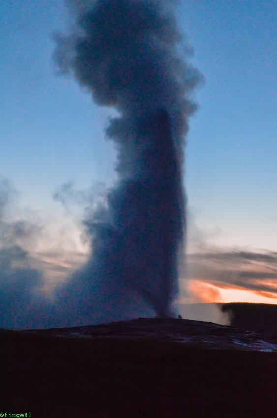 Leider lässt uns der Geysir etwas zu lange warten, kurz nach Sonnenuntergang bricht er endlich aus. Es war zwar noch etwas hell, aber für ein Flash-Foto zu spät – leider.