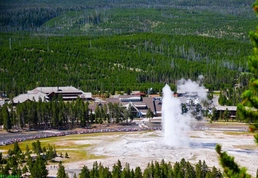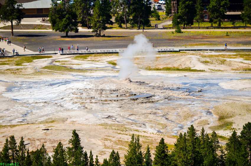 Die Möglichkeit dazu bietet ein Aufstieg auf den Geyser Hill. Irgendwie sind wir spät dran, der Old Faithful soll in gut 30 Minuten seine Show abliefern. Also gehen Sarah und Frank schon mal vor und Inge checkt aus. Der Weg führt recht steil bergauf, bald hat Sarah Frank abgehängt, aber beide kommen noch rechtzeitig oben am Viewpoint an. Inge gibt alles, um ebenfalls pünktlich zu sein und schafft es gerade noch, dann beginnt auch schon die Show. Der Blick über das Upper Geyser Basin beim Ausbruch ist beeindruckend.