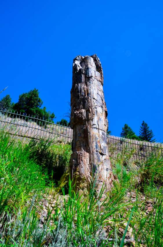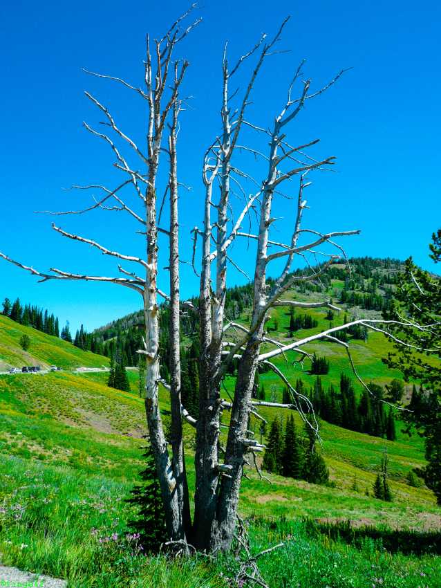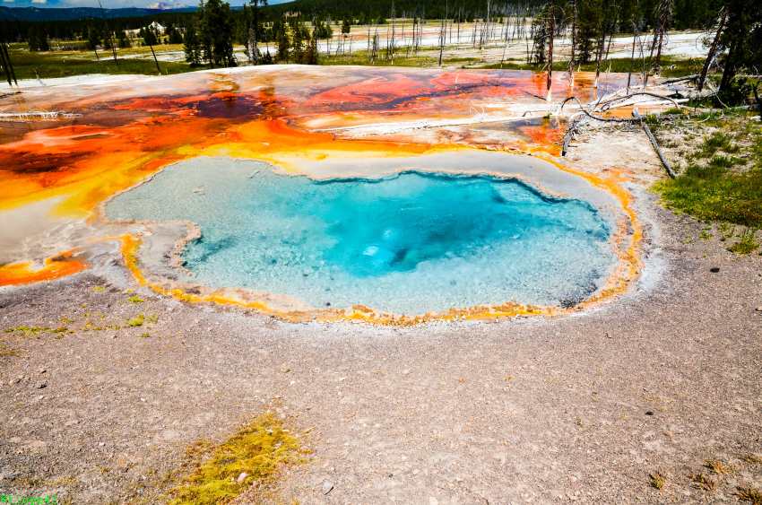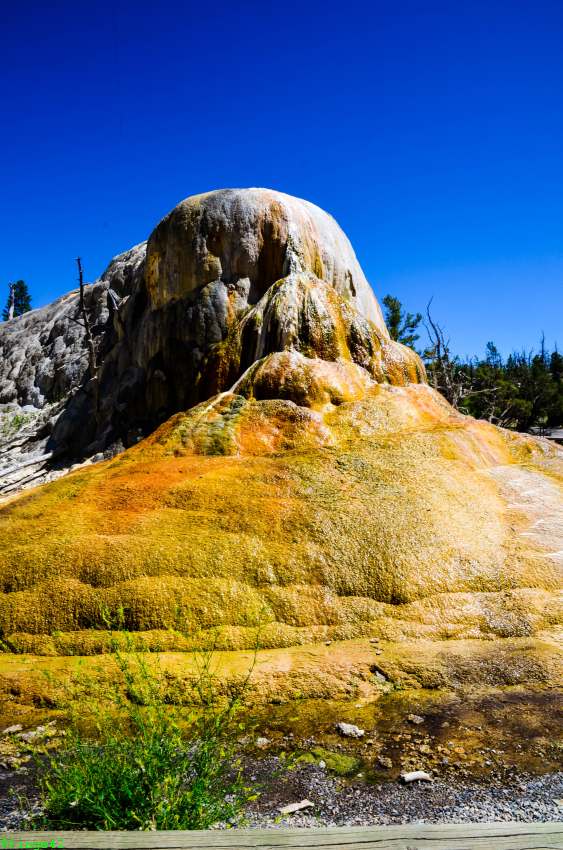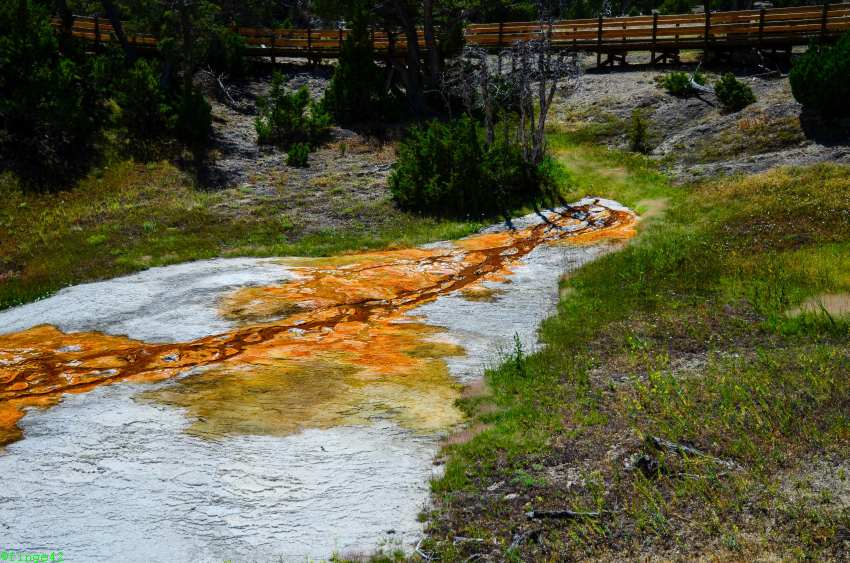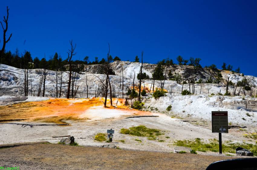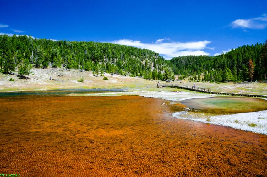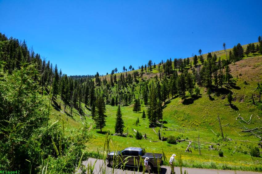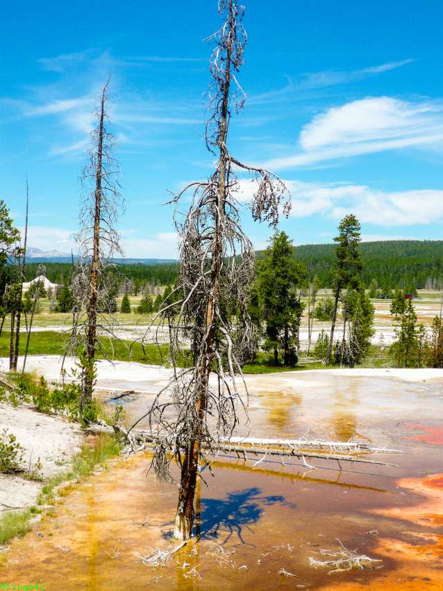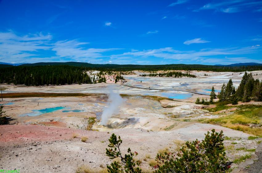 Weiter Richtung Norden erreichen wir das Norris Geyser Basin, die angeblich heißeste Gegend im Park. Die Parkplatzsuche ist nicht so einfach, aber nach zwei Runden wird etwas für uns frei. Es ist tatsächlich unglaublich heiß, einmal weil ein wunderbares Sommerwetter ist, aber auch, weil der Boden ordentlich Wärme abgibt. Wir gehen daher nur ein kurzes Stück, bis wir einen guten Überblick über das Porcelain Basin haben. Auch hier sieht man tolle Farben und es raucht und zischt.