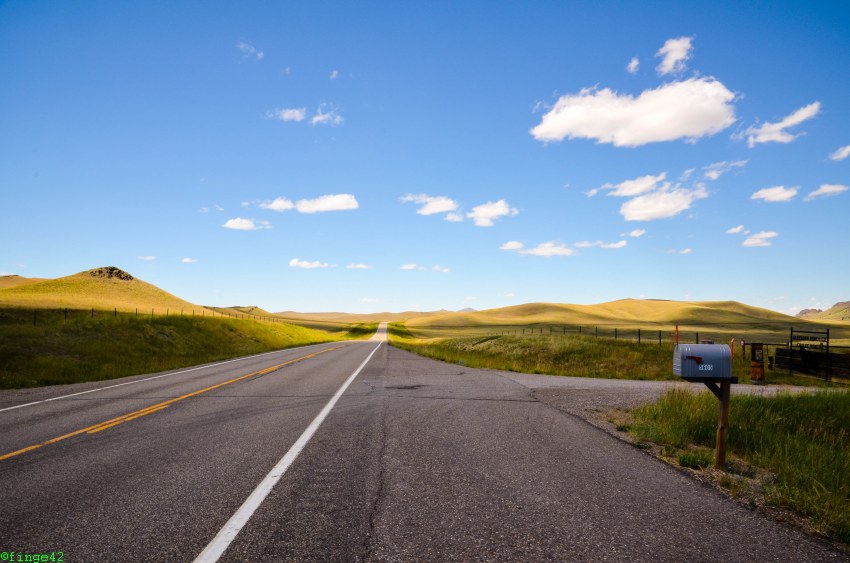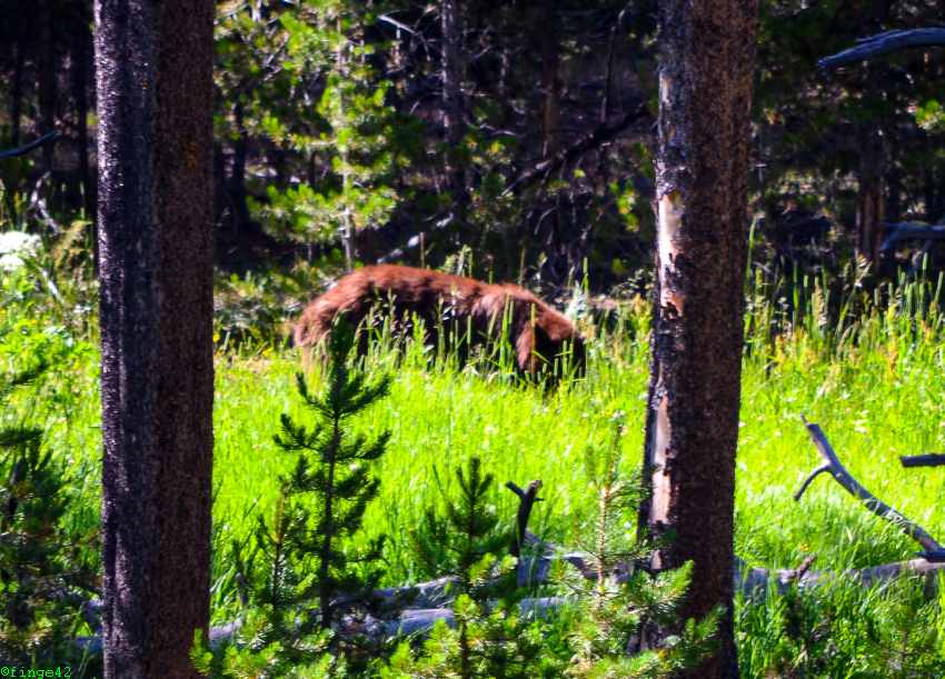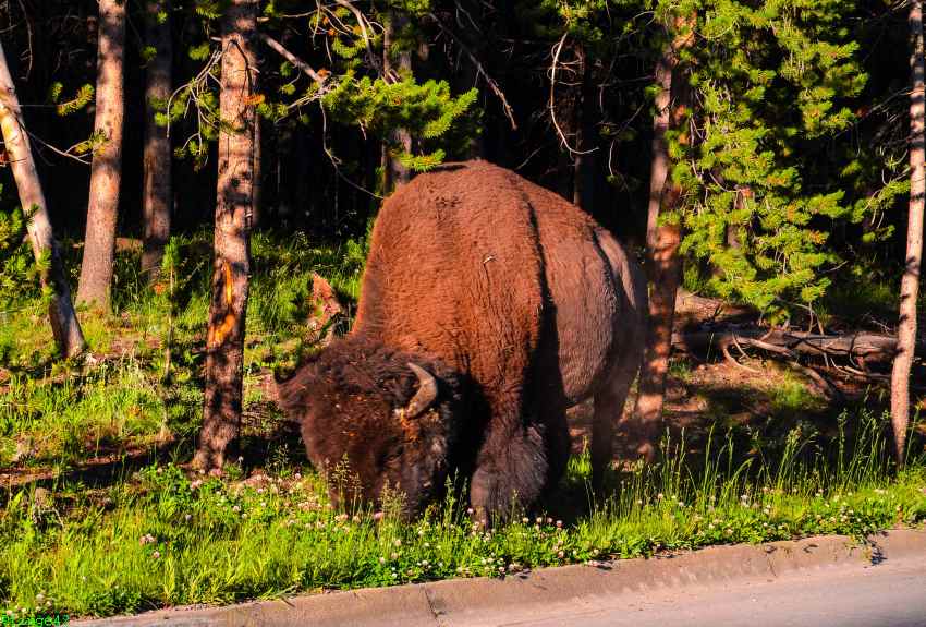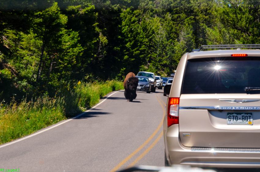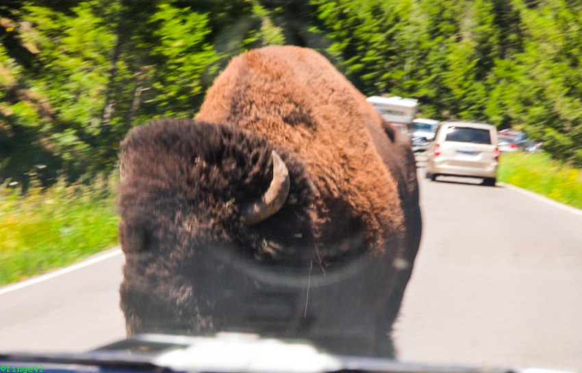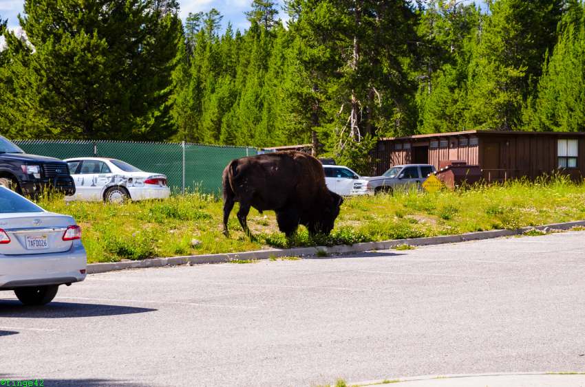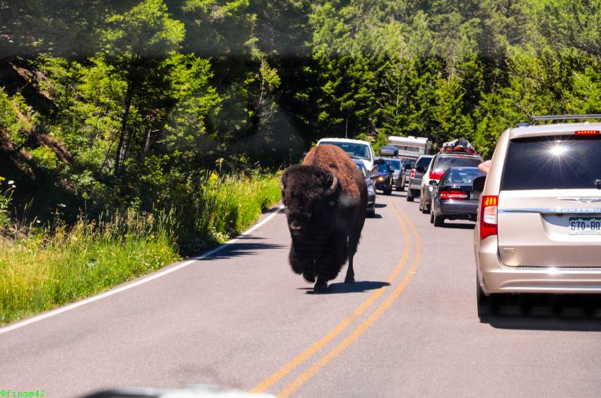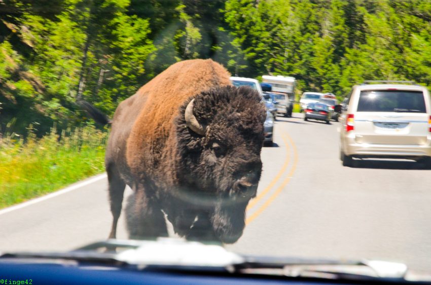 Nach einigen Fotos geht es auf die letzte Etappe zum Tagesziel, dem Canyon Village. Dort kommen wir am späten Nachmittag an, checken ein und fahren zu unserer Unterkunft, des Cascade Lodge. Auf dem Weg dorthin begegnet uns erstmals unser Hausbison, zunächst auf der Straße.
