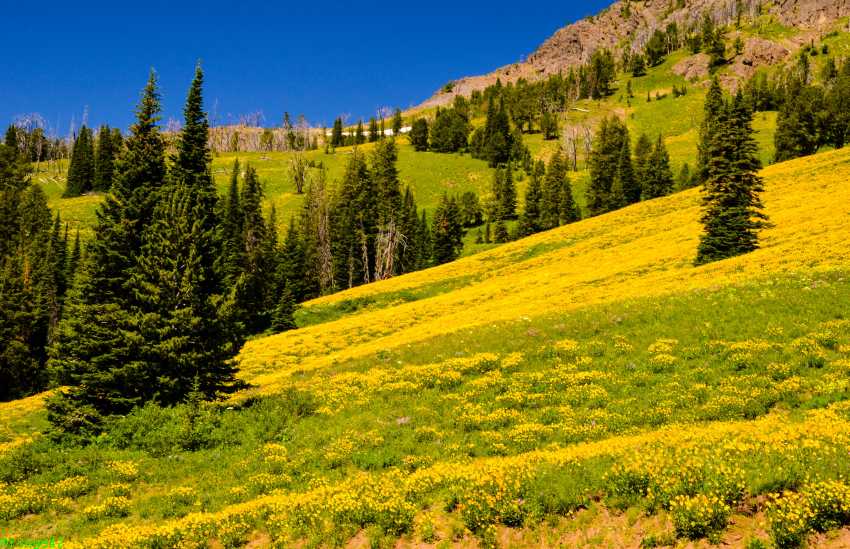 Dann geht es los, wir wollen zum Grand Prismatic Spring. Allerdings streben wir ein Foto von oben an. Dafür müssen wir – vielleicht nicht ganz legal – ohne Weg einen Hügel hinauf. Nach einiger Recherche im Vorfeld der Reise hatten wir uns entschieden, einen der Hügel am Fairy Falls Trail zu besteigen. Also parken wir am Fairy Falls Trailhead und gehen ein Stück auf dem ausgeschilderten Weg.