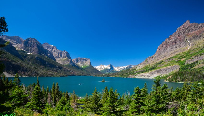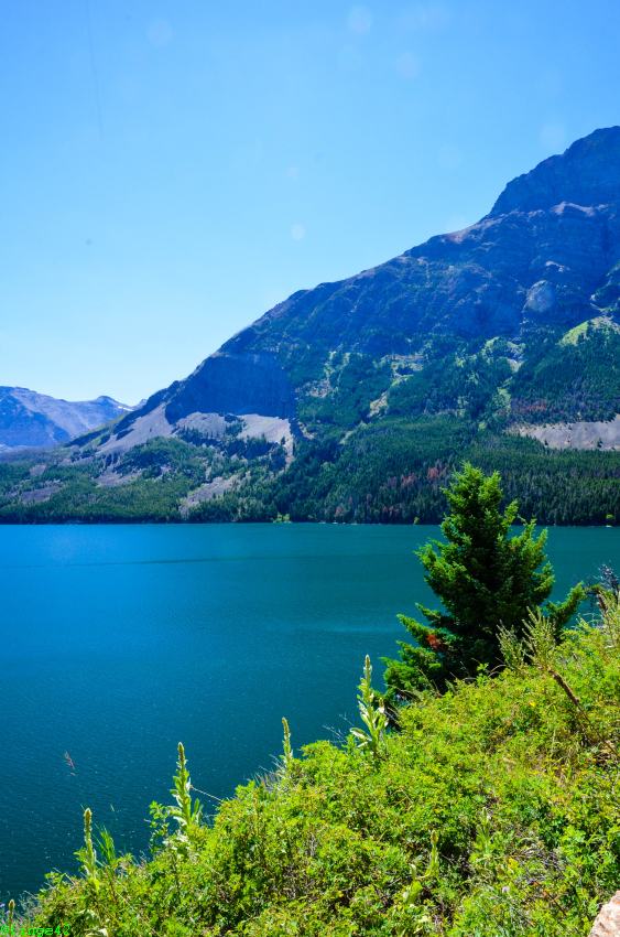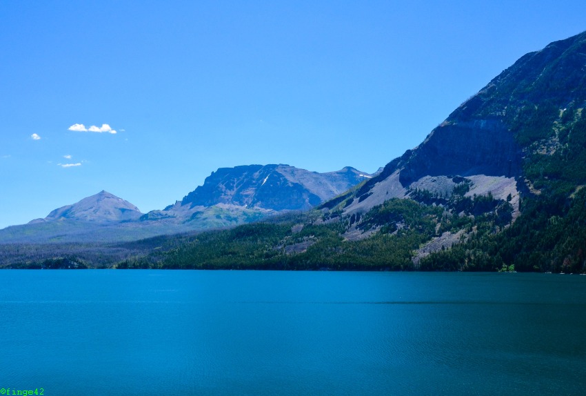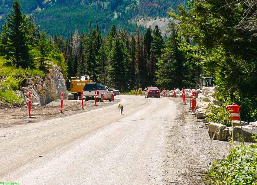 Einen ersten Fotostopp legen wir am St. Mary Lake ein und genießen den Ausblick auf den See und die kleine Insel Goat Island. Ein Kojote lässt sich vom Autoverkehr nicht beeindrucken und überquert einfach gemütlich die Straße.