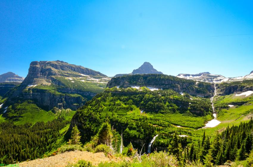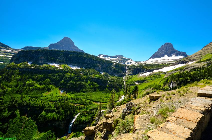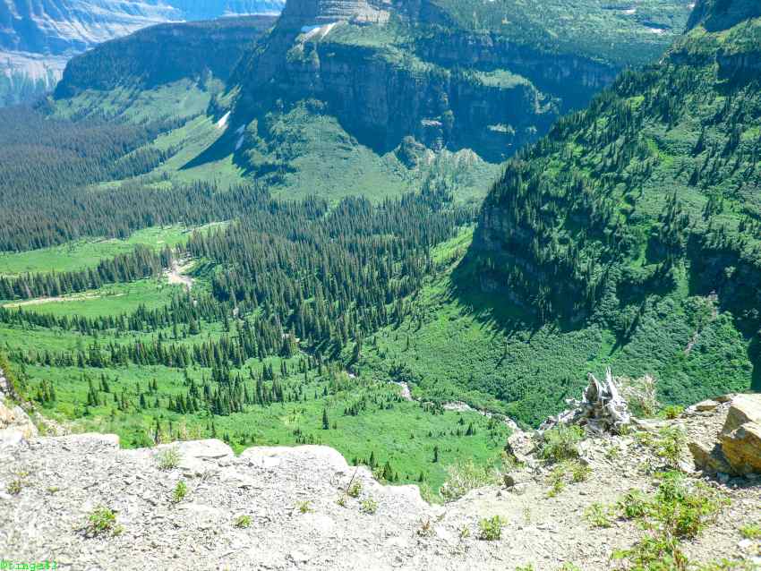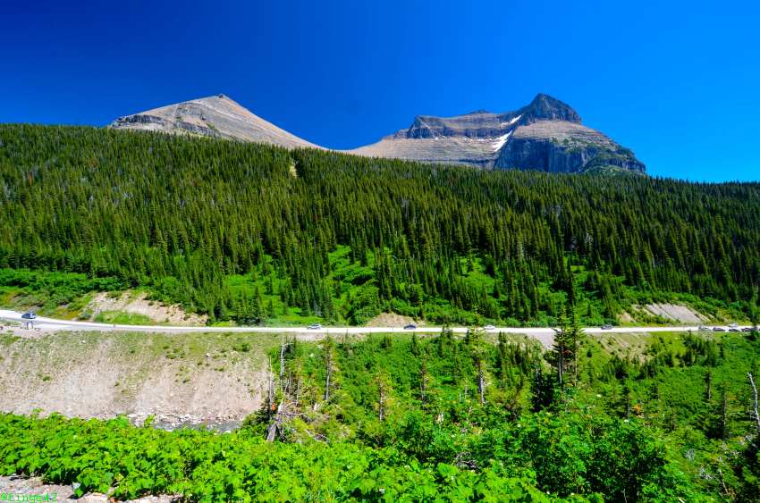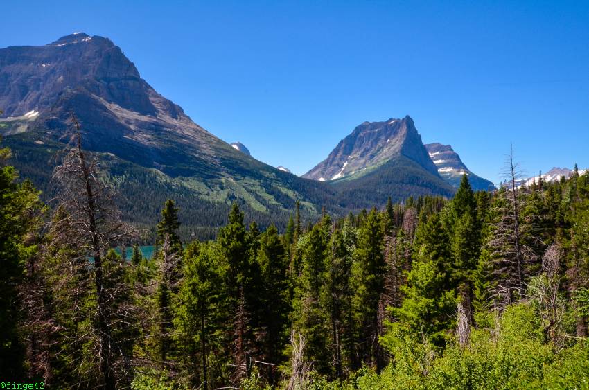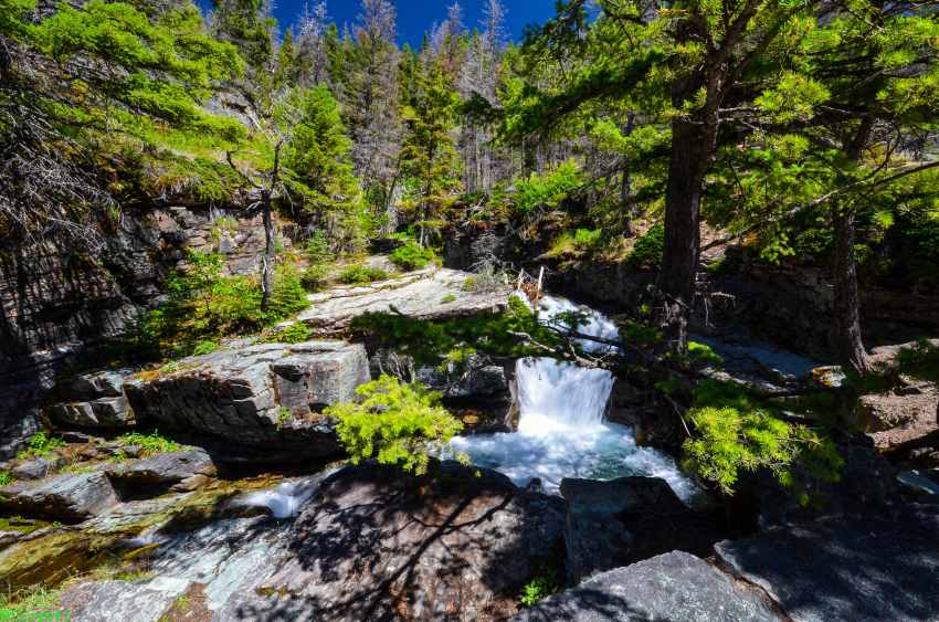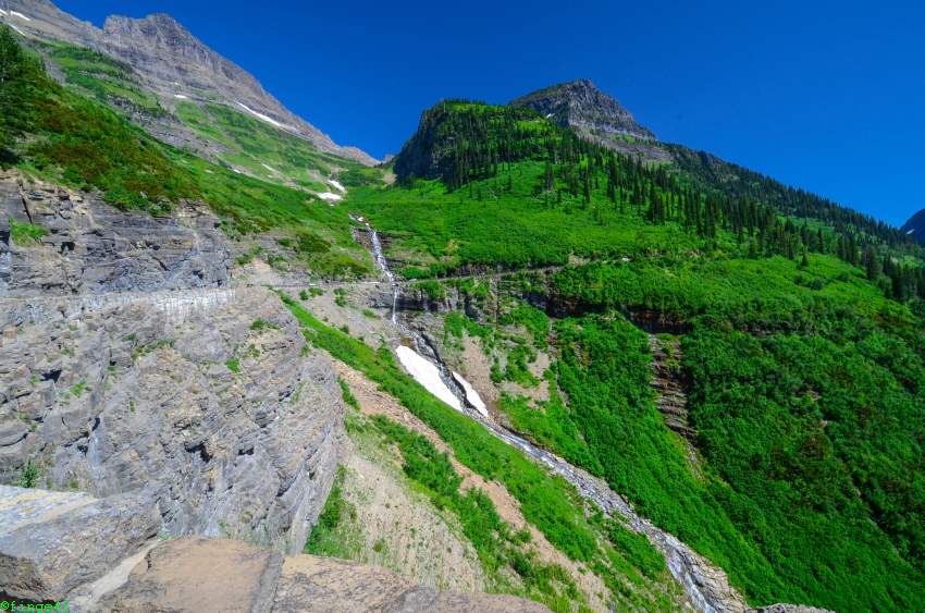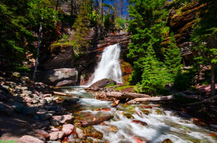 Am Parkplatz an der Sunrift Gorge stellen wir das Auto ab und nehmen den Trail zu den Baring Falls. Es ist zwar sehr warm, aber der Trail liegt meist im Schatten, deshalb kann man es aushalten. Kurz vor den Wasserfällen machen wir Bekanntschaft mit ein paar Wasseramseln, die sich mit lautem Gezwitscher in die kalten Fluten werfen. Sie halten nur den Schnabel, wenn sie unter Wasser sind. An den nahen Wasserfällen bleiben wir nur kurz, dann geht es (bergauf) zurück zur Straße und von dort weiter Richtung Logan Pass.