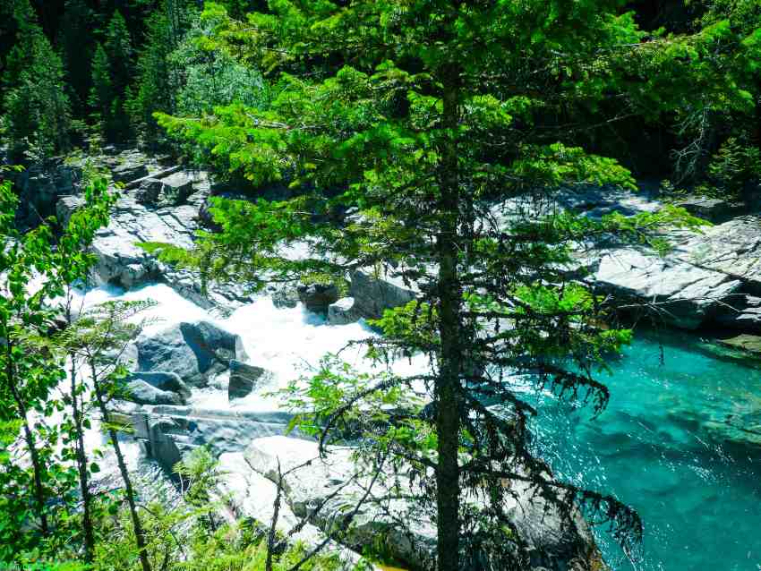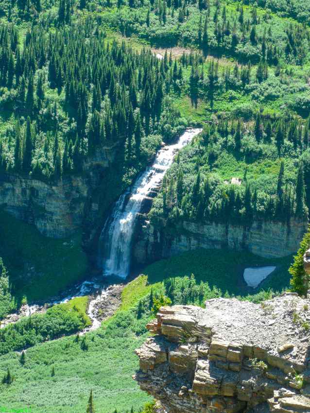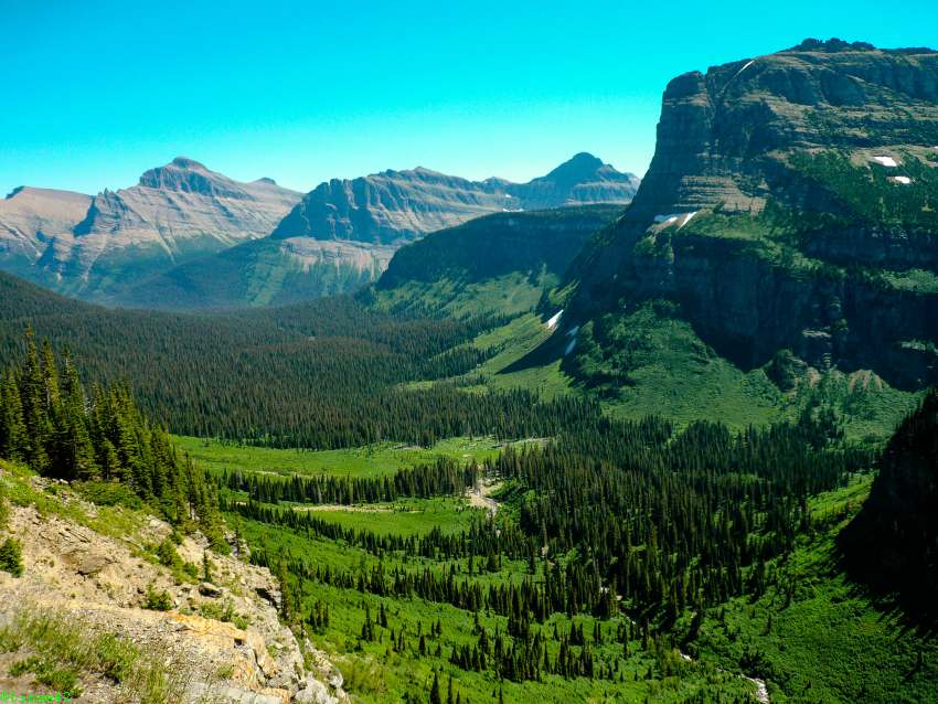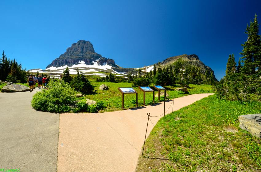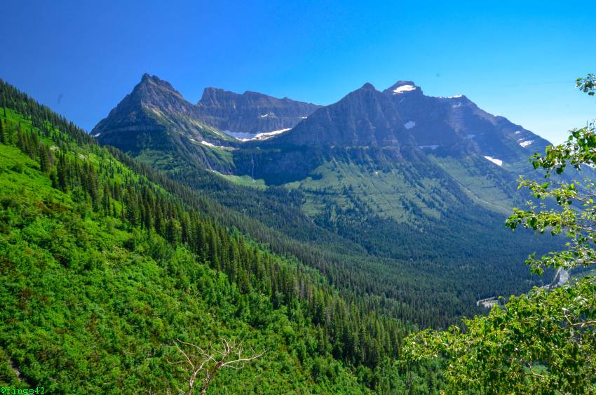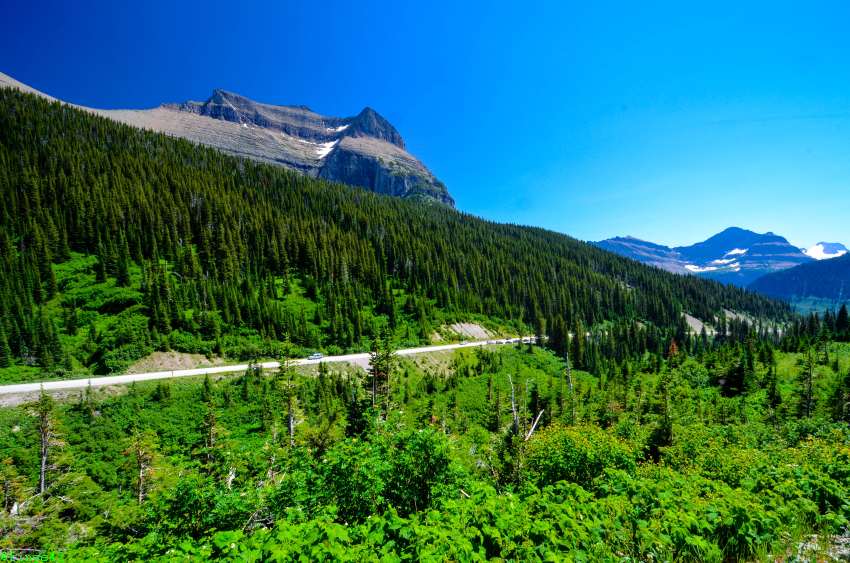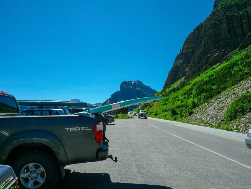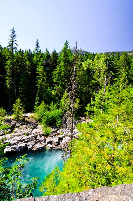 Am Parkplatz an der Sunrift Gorge stellen wir das Auto ab und nehmen den Trail zu den Baring Falls. Es ist zwar sehr warm, aber der Trail liegt meist im Schatten, deshalb kann man es aushalten. Kurz vor den Wasserfällen machen wir Bekanntschaft mit ein paar Wasseramseln, die sich mit lautem Gezwitscher in die kalten Fluten werfen. Sie halten nur den Schnabel, wenn sie unter Wasser sind. An den nahen Wasserfällen bleiben wir nur kurz, dann geht es (bergauf) zurück zur Straße und von dort weiter Richtung Logan Pass.