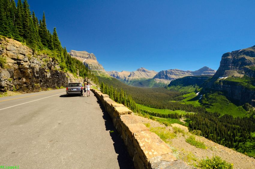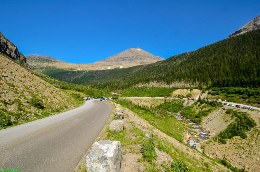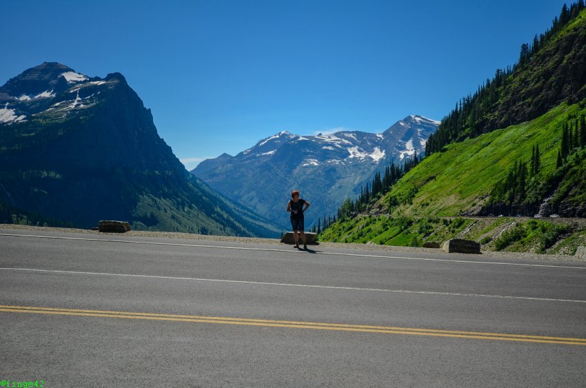 Alle sind heute etwas müde, deshalb gehen wir nicht auf den Highline Trail, sondern fahren weiter. Als wir dann sehen, wie der Trail an den Felsen entlang führt, denken wir, jetzt haben wir wohl etwas verpasst, aber zurückfahren will auch keiner. Dafür genießen wir beim Fahren die atemberaubende Bergkulisse und legen viele kurze Fotostopps ein.