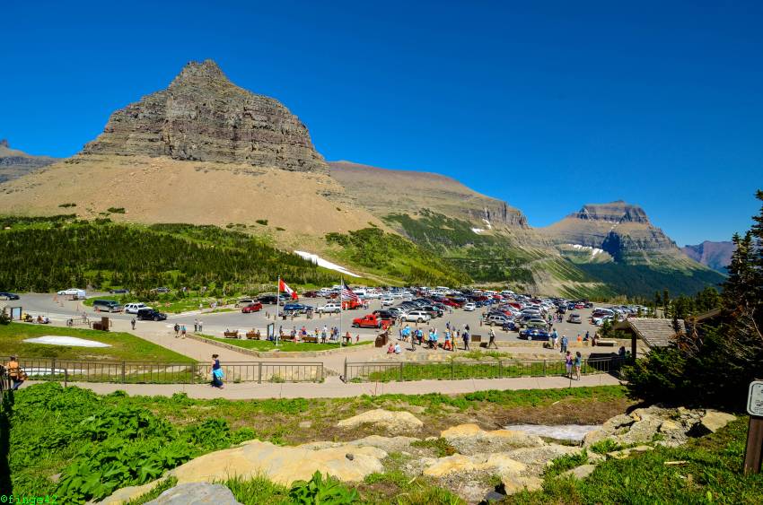 Wir halten immer wieder an und genießen die Aussicht. Am Logan Pass angekommen steigen die Frauen schon mal aus und Frank fährt Runde um Runde auf dem Parkplatz, auf der Suche nach einer freien Stelle. Es ist rappelvoll. Irgendwann gelingt es ihm das Auto abzustellen und wir sehen uns zusammen etwas um. Bei sommerlichen Temperaturen liegt tatsächlich noch etwas Schnee.