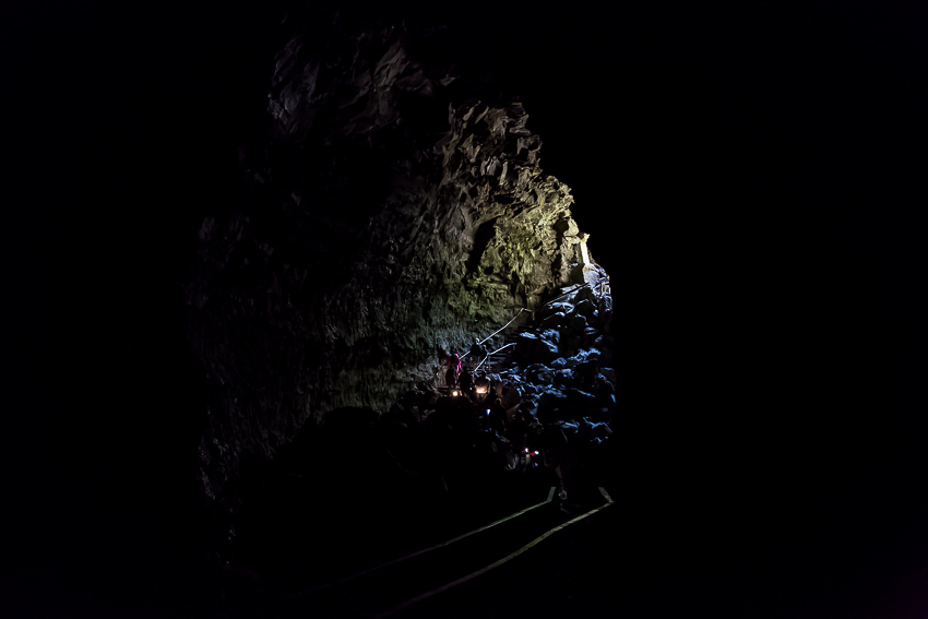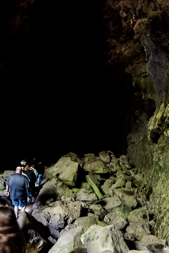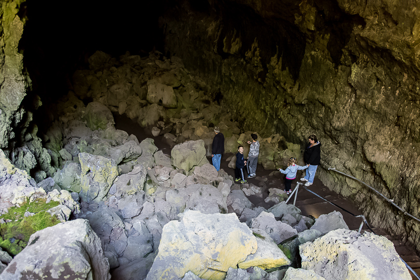 Nach rund einer Stunde gingen wir dann zurück zum Womo und fuhren auf dem Highway 97 weiter in Richtung Süden zur „Lava River Cave“. Dies ist eine 5200 Fuß lange Röhre, durch die früher Lava floss. Die Temperatur im Inneren beträgt bereits nach wenigen Metern nur noch konstante 5°C. Und es ist "PitchBlack", also wirklich stockdunkel. Wir hatten zum Glück 2 starke LED- Taschenlampen mit dabei, ansonsten kann man sich für ein paar $ entsprechende Gas,- oder LED-Lampen ausleihen. Wir gingen in der Höhle vielleicht 250 Meter, dann drehten wir wieder um. Paul wollte nicht mehr so richtig weiter gehen und man lief ständig Gefahr, über größere Steine zu stolpern. Da halfen auch die Taschenlampen der anderen Besucher nicht viel. Alles in allem aber sehr beeindruckend.