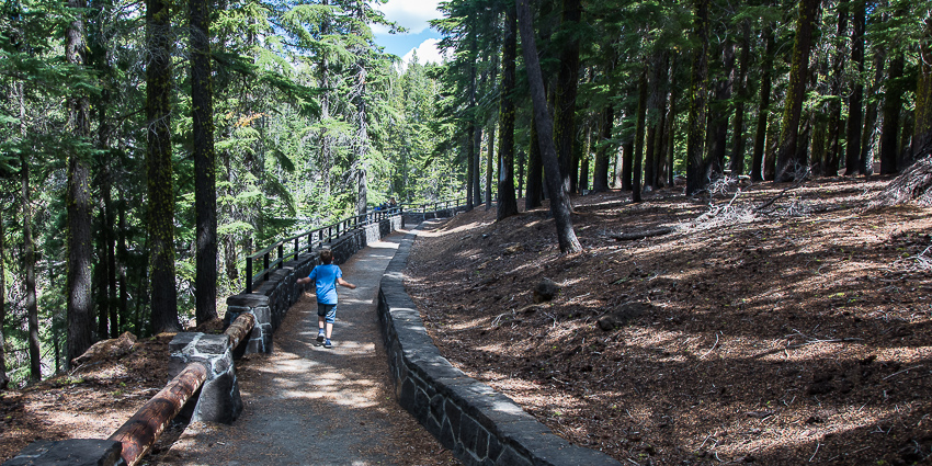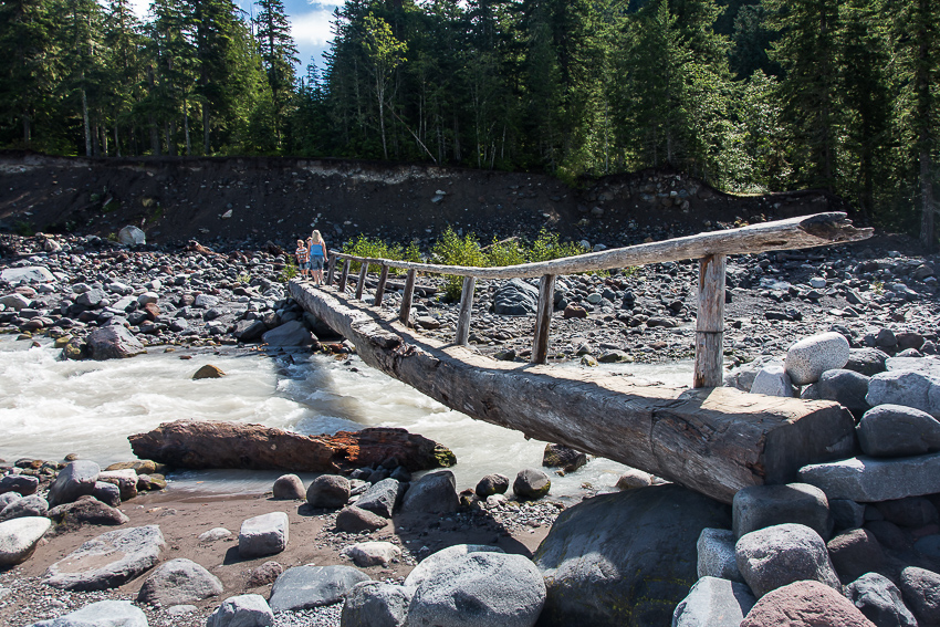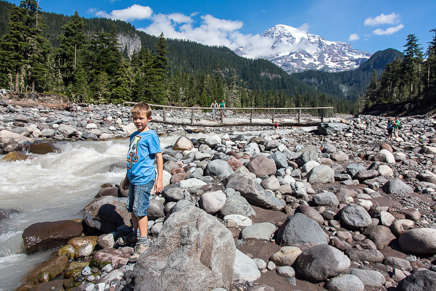 Nach einer halben Stunde gingen wir wieder zum WoMo und fuhren weiter Richtung „Henry M. Jackson Memorial Visitor Center“. Als wir dort gegen kurz vor 13.00 aufschlugen, war der Parkplatz schon rappelvoll - wir mussten die Straße ein ganzes Stück weiter fahren und unser schnuckeliges WoMo an den Rand der Straße quetschten. Das erledigte übrigens Birgit, die ihre „Berührungsängste“ mit dem WoMo zum Großteil verloren hatte. Wir schauten uns das schön gemachte Visitor Center an und liefen dann ca. 40 Minuten den „Glacier Vista Trail" Richtung Nisqually Gletscher. Paul nölte zwischendurch und ich musste ihm immer wieder klar machen, das ihn zum Teil 3 jährige ohne zu meckern überholten. Ehrlicherweise muss ich aber zugeben, das der kleine „Walk“ auch aufgrund der unerwartet hohen Temperatur von irgendwas um die 65 Fahrenheit, doch nicht ganz ohne war. An einer Weggabelung zog Birgit dann die Reißleine. Sie blieb mit den Kindern dort, es gab einen kleinen Bach an dem sie planschen und spielen konnten. Ich ging noch mal 20 Minuten weiter bis zur nächsten Kurve, in der Hoffnung näher an die Gletscherzunge zu kommen. Der Weg war mittlerweile doch nicht ohne und ich hörte zwischendurch den einen oder anderen fluchen und schnauben.