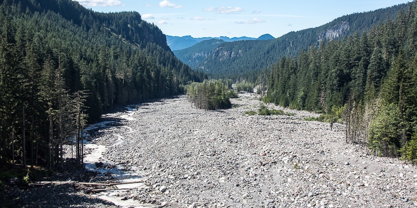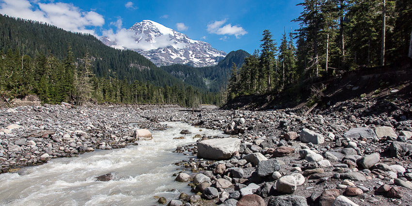 Den ersten 10 minütigen Stopp machten wir am „Kautz Creek Trail". Von hier hatte man einen ersten imposanten Blick auf „Rainier“.