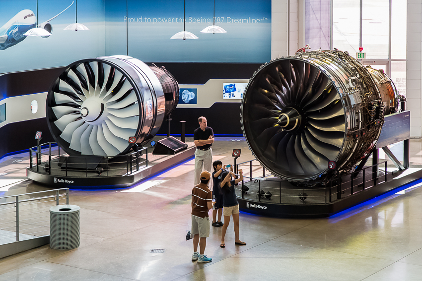 Wir waren keine 5 Minuten unterwegs, als die erste Tankstelle auftauchte. Da der Tank nur noch zu rund einem Viertel voll war, beschlossen wir unsere fahrende Unterkunft voll zu tanken. Per Kreditkarte zahlte ich 2x 100$, dann hatte ich keine Lust mehr. Die Tanknadel zeigte fast voll an, ein paar Gallonen wären also bestimmt noch reingegangen. Nach einer knappen Stunde sind wir dann Punkt fünf vor 11.00 an den Boeing- Werken in Everett angekommen. Wir liefen die paar Meter vom RV- Parkplatz zum Besucherzentrum und checkten mit Hilfe der Kreditkarte ein. Paul wurde kurz gemustert und musste dann sofort zum Nachmessen. Die nahmen das mit der Mindestgröße von 1,22m doch tatsächlich ernst. Auf den mm - die Haare wurden von einer freundlichen Angestellten noch kurz nach oben drapiert - hatte Paul die erforderliche Mindestgröße erreicht. Danach mussten wir noch 20 Minuten bis zum „Boarding“ warten. Bei der letzten Kontrolle wurden einem dann entweder rote Karten für Bus A, oder blaue Karten für Bus B zugeteilt. Das Mitnehmen jeglicher Dinge (Film, Foto, Handtaschen, Rucksäcke, etc) war strengstens verboten.