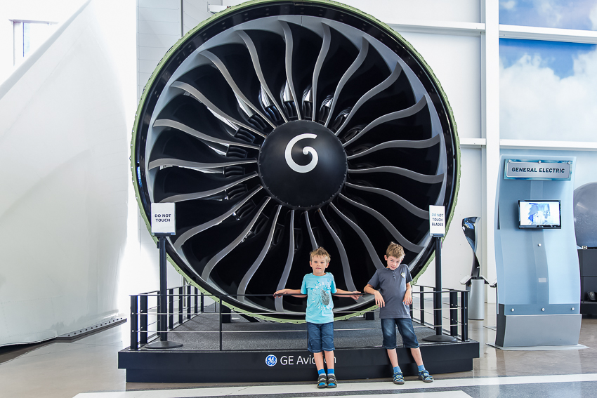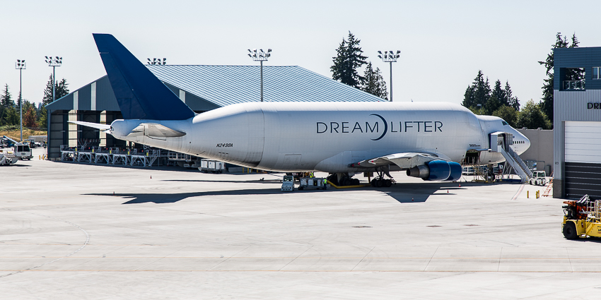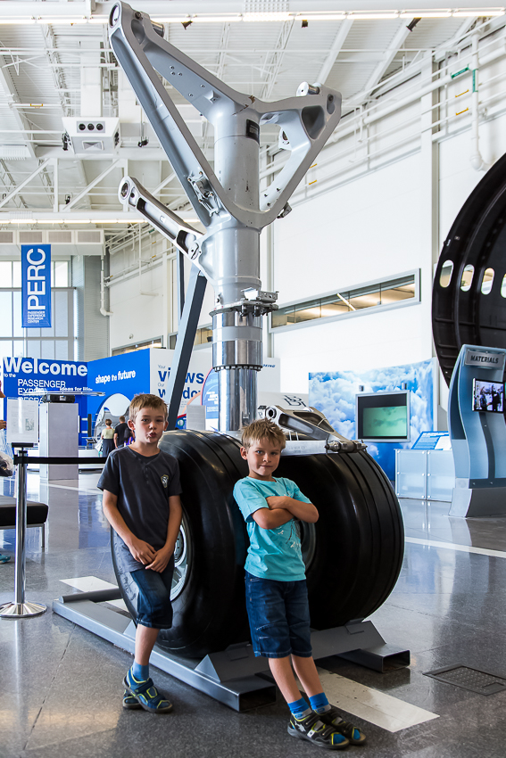 Als erstes wurde dann ein ca. 10 minütiger interessanter Film über Boeing gezeigt. Dann hieß es in die verschiedenen Busse einsteigen. Die Fahrt dauerte knappe 5 Minuten, dann waren wir am größten Gebäude der Welt angekommen. Wooww - wirklich gigantisch. Der erste Stopp war bei den Montagelinien für die Boeing 747. Wir stiegen aus und nach 30 Metern ging es eine Treppe runter in einen der vielen Versorgungstunnel des gigantischen Bau’s. Nach ca. 200m laufen ging es in einem Aufzug bis zu einer Aussichtsplattform. Von hier aus hatte man einen hervorragenden Blick in die wirklich gigantischen Werkshallen - Wahnsinn. Schade das man keine Foto’s machen durfte. Nach einigen Erklärungen, das eine oder andere übersetzten Birgit und ich für die Kinder, ging es dann wieder zurück in den Bus. Nun fuhren wir weiter zu den Montagelinien für die Boeing 777 und die 787 - den Dreamliner. Auch hier mussten wir erst wieder einen Versorgungskorridor entlanglaufen, bevor es wiederum im Lastenaufzug nach oben in die Galerie ging. Auch hier wieder ein wirklich unglaublicher Blick in die Werkhallen. Nach weiteren Erklärungen ging es nach ca. 10-15 Minuten zurück zum Bus. Die Tour ging zurück zum Besucherzentrum und dauerte insgesamt genau 1,5 Stunden. Der Bus setzte uns genau vor den Gift- Shop ab, wo Tom und Paul sich noch jeder ein Souvenir mitnehmen durften. Tom entschied sich für für ein Modell der guten alten Boeing 747, Paul für die Boeing 777. Dann schlenderten wir noch 30 Minuten in der „Future of Flight“ Austellung umher, hier durften dann auch endlich Foto’s gemacht werden. Während Paul wieder einen Hungeranfall bekam und mit Birgit in das angeschlossene Café ging um eine Softbrezel zu kaufen, ging ich mit Tom auf die Aussichtsplattform. Hier konnte man den Dreamlifter bestaunen und hatte einen tollen Blick auf all die neuen Flugzeuge und die soeben besuchte Werkshalle.
