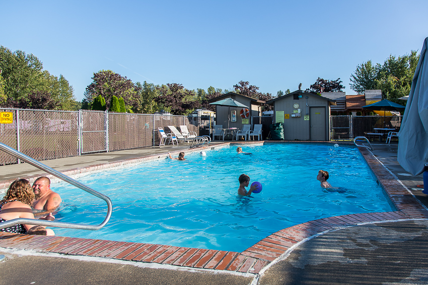 Ein wirklich toller Plan - wären da nur nicht diese ständigen Baustellen und die nicht auffindbaren Parkplätze für übergroße RV’s. Nach einigem rumgegurke wurde also auch dieser Plan wieder verworfen und wir machten uns endgültig auf zum KOA nahe Seattle. Dies war vermutlich der nächste dumme Plan, man las ja nirgends was wirklich gutes über diesen KOA - ein Stadtcampground eben. Aber Tacoma/ Seattle ist wohl von den Möglichkeiten nach Downtown zu kommen noch einer der besten Wahlmöglichkeiten, wenn man mit dem Wohnmobil unterwegs ist. Nach einem kleinen Stau kamen wir dort um kurz nach 17.00 an, dockten wieder geschwind alles an und die Kinder verschwanden im beheizten „Outdoor- Pool. Ich machte ein paar Bilder vom KOA, der auf den ersten Blick nicht so schlimm aussah wie erwartet, dann bin auch ich zu Tom und Paul in den Pool gesprungen.
