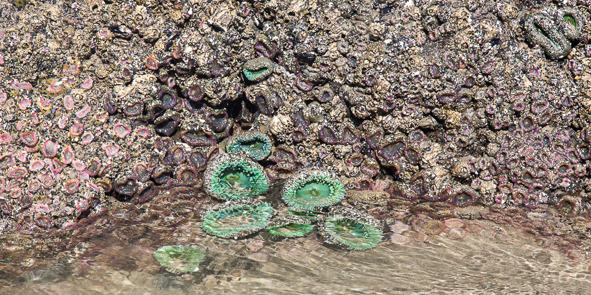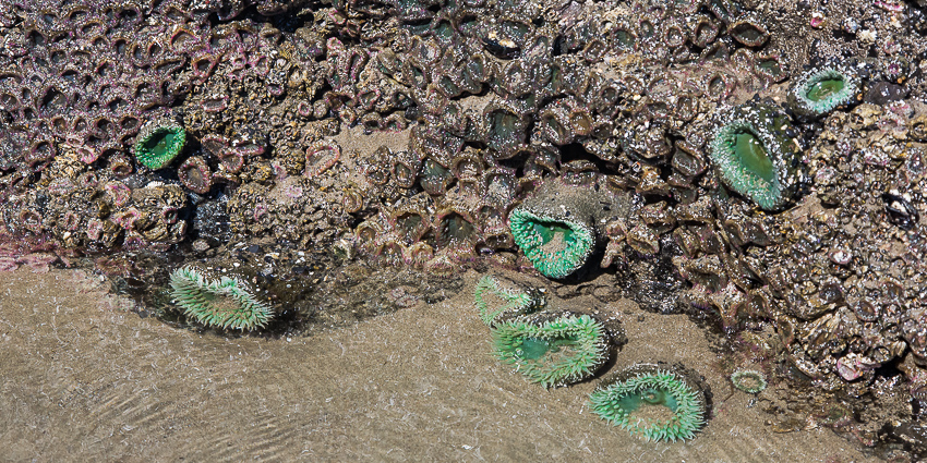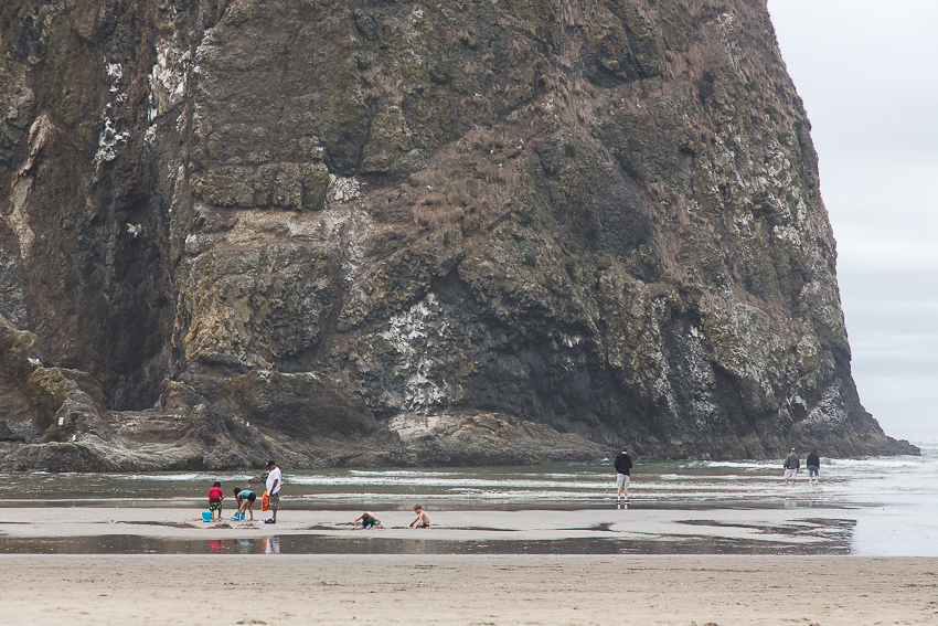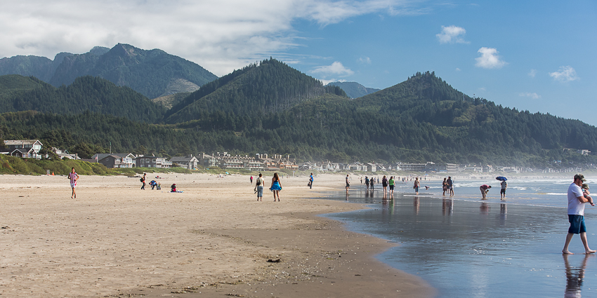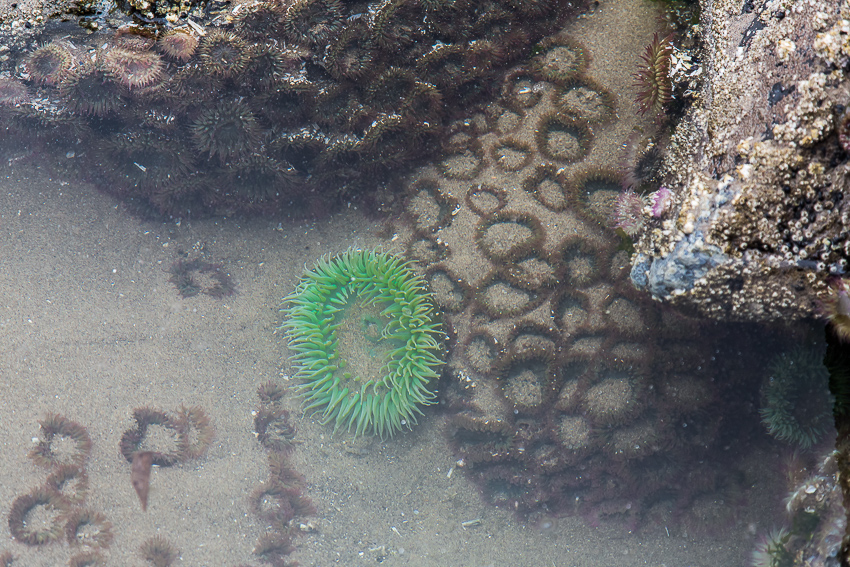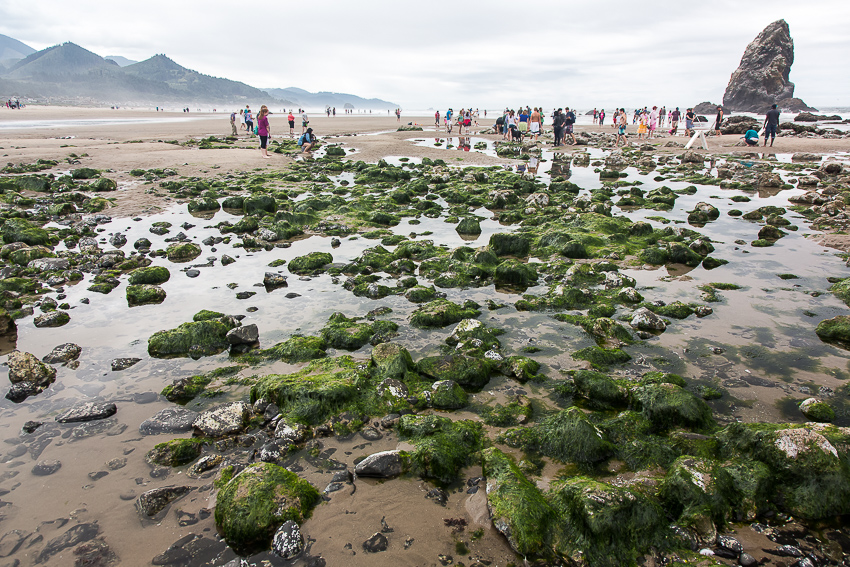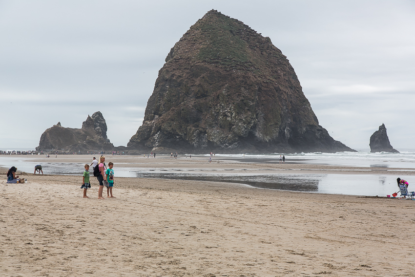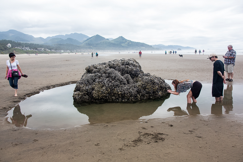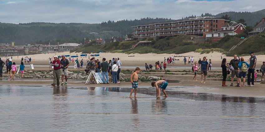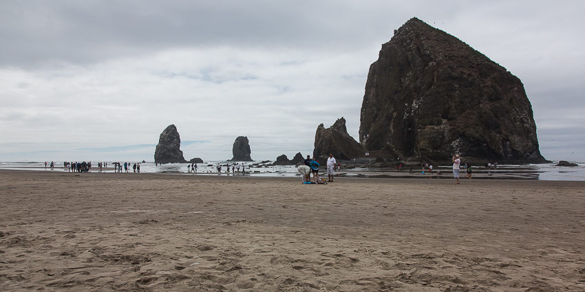 Bis zum Strand waren es dann noch 5 Minuten Fussmarsch, dann erstrahlte der Haystack Rock in voller Größe. Bis zu den vorgelagerten Tide- Pools waren es noch einmal knapp über 5 Minuten zu Fuß und man sah schon die Menschenmassen herumstehen. So voll hatten wir es uns nicht vorgestellt. Dort angekommen schauten wir uns die Seeanemonen und einen !!! Seestern an. Mehr Seesterne gab es nicht. Ich unterhielt mich mit einem der vielen freiwilligen „Aufpasser“, die dafür sorgten das die Leute nicht einfach überall wild herumtrampelten. Die Seesterne sind seit 2 Jahren von irgendeiner Krankheit befallen und sind seither nur noch selten im flachen Wasser anzutreffen. Was die genaue Ursache ist konnte mir die nette Dame leider auch nicht sagen, mahnte aber an, dass man heutzutage umso mehr auf die Umwelt acht geben müsse. Tja, soviel zu den Seesternen. Da die Low Tide/ High Tide Tabelle im Internet nicht stimmte - für Montag, 1. September war die Low- Tide für 12.48 vorhergesagt - wurde stattdessen schon kurz nach 12.00 zum Rückzug geblasen. Die Low-Tide war heute bereits um 11Uhr noch was gewesen. Na ja, die Kinder hatten auch so ihren Spaß am und im Wasser. Mir wäre das Wasser viiiel zu kalt gewesen - aber ich bin ja auch alt.