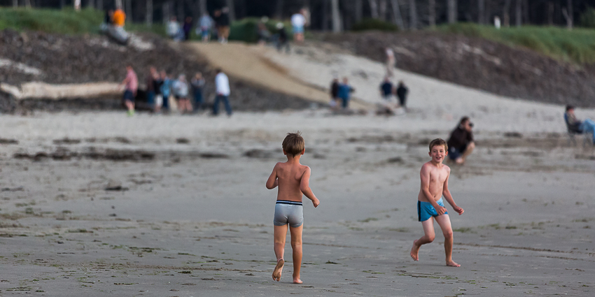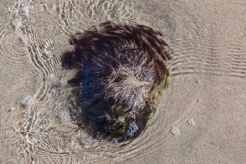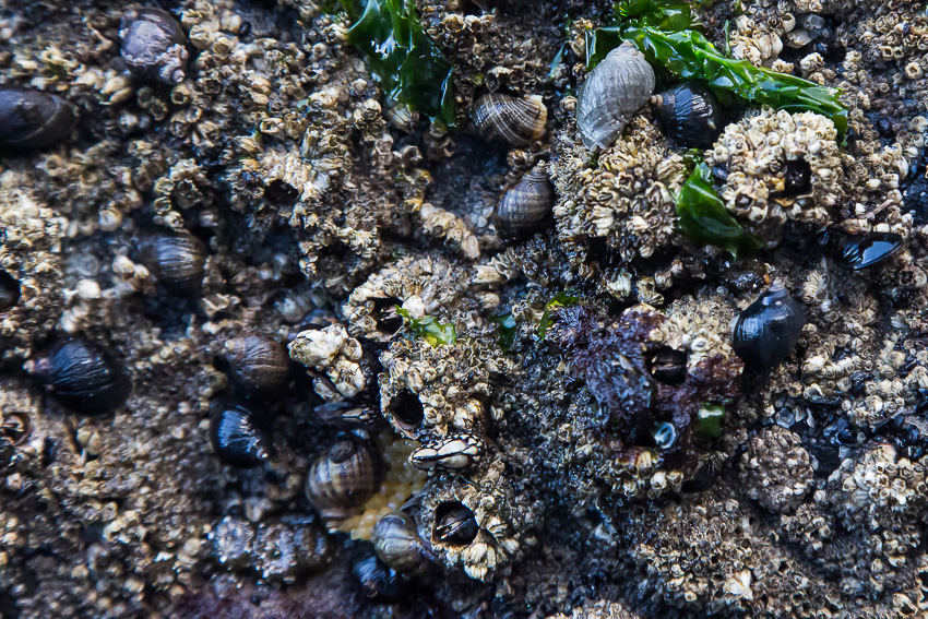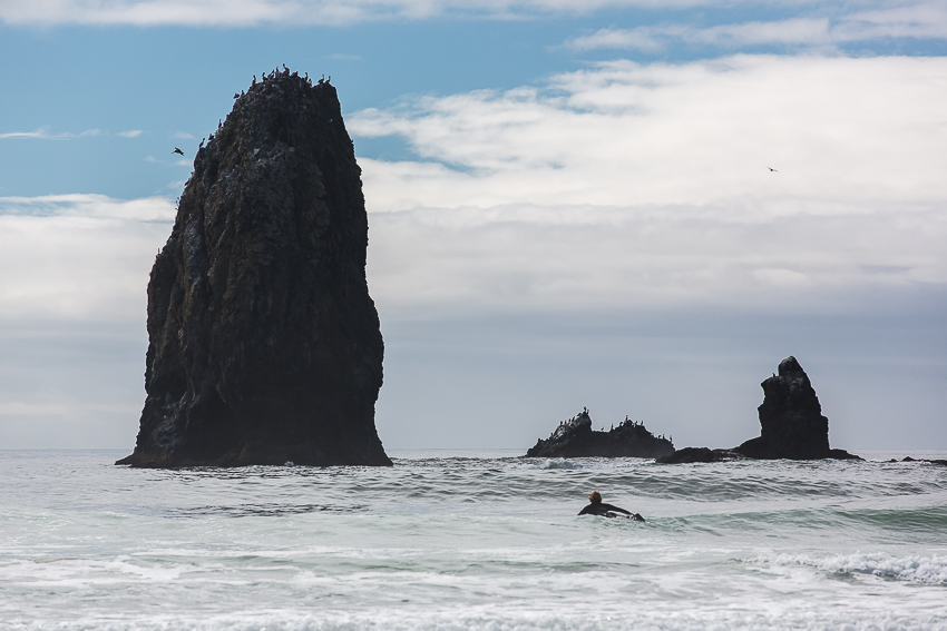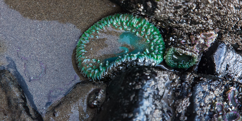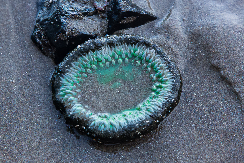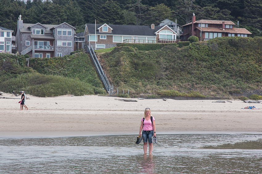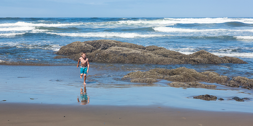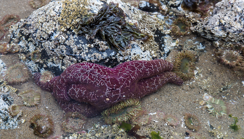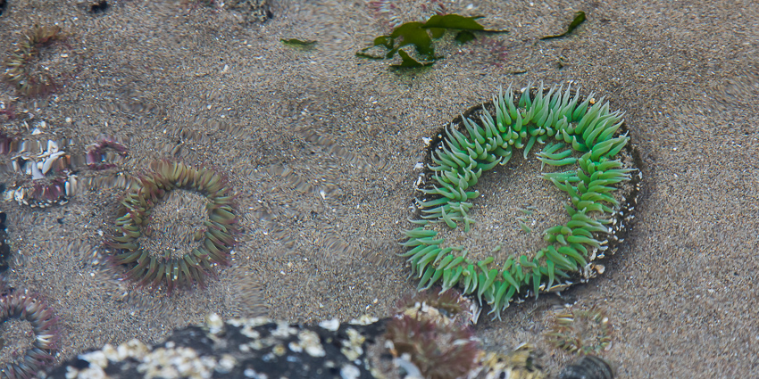 Bis zum Strand waren es dann noch 5 Minuten Fussmarsch, dann erstrahlte der Haystack Rock in voller Größe. Bis zu den vorgelagerten Tide- Pools waren es noch einmal knapp über 5 Minuten zu Fuß und man sah schon die Menschenmassen herumstehen. So voll hatten wir es uns nicht vorgestellt. Dort angekommen schauten wir uns die Seeanemonen und einen !!! Seestern an. Mehr Seesterne gab es nicht. Ich unterhielt mich mit einem der vielen freiwilligen „Aufpasser“, die dafür sorgten das die Leute nicht einfach überall wild herumtrampelten. Die Seesterne sind seit 2 Jahren von irgendeiner Krankheit befallen und sind seither nur noch selten im flachen Wasser anzutreffen. Was die genaue Ursache ist konnte mir die nette Dame leider auch nicht sagen, mahnte aber an, dass man heutzutage umso mehr auf die Umwelt acht geben müsse. Tja, soviel zu den Seesternen. Da die Low Tide/ High Tide Tabelle im Internet nicht stimmte - für Montag, 1. September war die Low- Tide für 12.48 vorhergesagt - wurde stattdessen schon kurz nach 12.00 zum Rückzug geblasen. Die Low-Tide war heute bereits um 11Uhr noch was gewesen. Na ja, die Kinder hatten auch so ihren Spaß am und im Wasser. Mir wäre das Wasser viiiel zu kalt gewesen - aber ich bin ja auch alt.