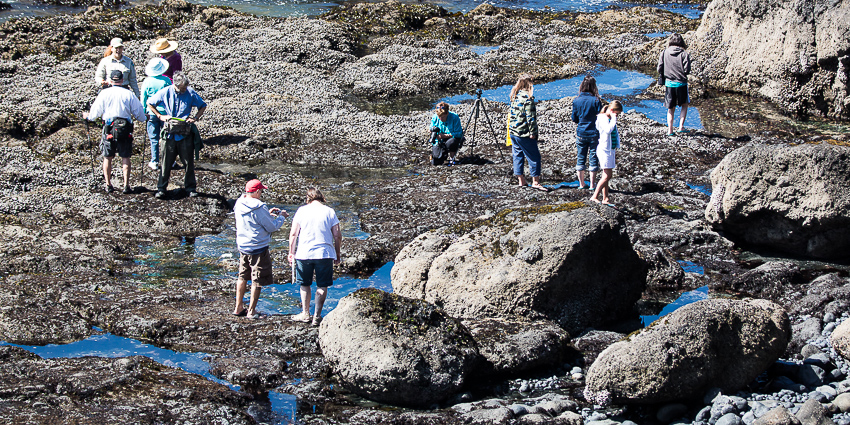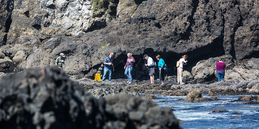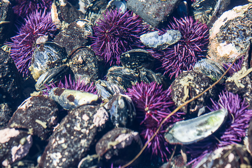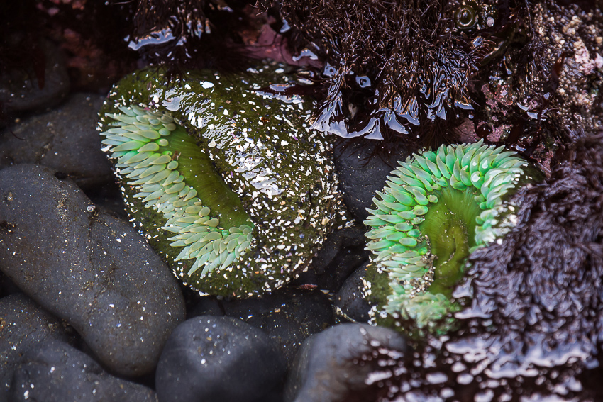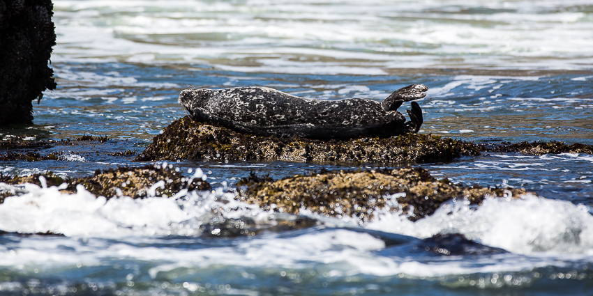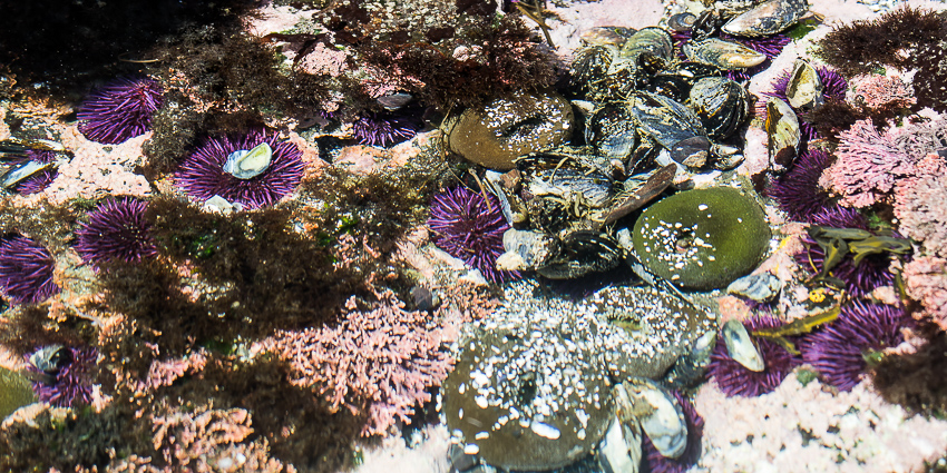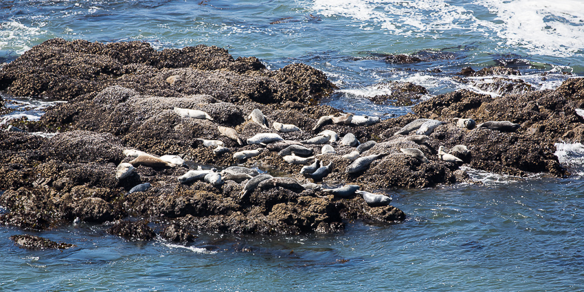 Wir liefen den Weg zurück Richtung Visitor Center, von dort ging es weiter zum Leuchtturm. Auf halben Weg dorthin entdeckten wir weiter unten im Meer auf einem Felsen eine Horde Seelöwen. 150 Meter weiter ging dann eine Treppe hinab zum „Cobble Beach“. Dort waren noch einmal „echte“ Tidepools und schon von oben sah man ca. 2 Dutzend Menschen zwischen den Felsen rumwuseln. Ahha, hier scheinen wir richtig zu sein - wenn da so viel los ist, muss es ja auch was zu sehen geben. Also den Leuchtturm nach hinten geschoben und geschwind die Treppe hinabgestiegen. Vom Timing her lagen wir immer noch perfekt in Bezug auf die „Low Tide“. Unten angekommen dann endlich ein Tidepool, wie wir ihn uns vorgestellt hatten. Es gab Seesterne (wir haben 7 von angeblich 10 noch vorhanden gefunden), Seeigel und die doch recht häufig anzutreffenden Seeanemonen. Über eine Stunde wuselten wir zwischen den Felsen umher, zwischendurch gingen wir am Kieselstrand in Richtung Seelöwen. Dort kletterten wir einen Felsen im Meer hinauf und machten es uns dort bequem. Von hier konnte man gut die kleine Seelöwen Kolonie beobachten - und umgekehrt diese auch uns. Ständig schwammen 3-4 Seelöwen ca. 30-40 Meter von uns entfernt im Wasser. Immer in unsere Richtung schauend. Man hatte den Eindruck, diese würden uns genauso interessiert beobachten wie umgekehrt.