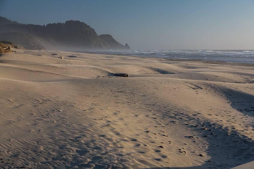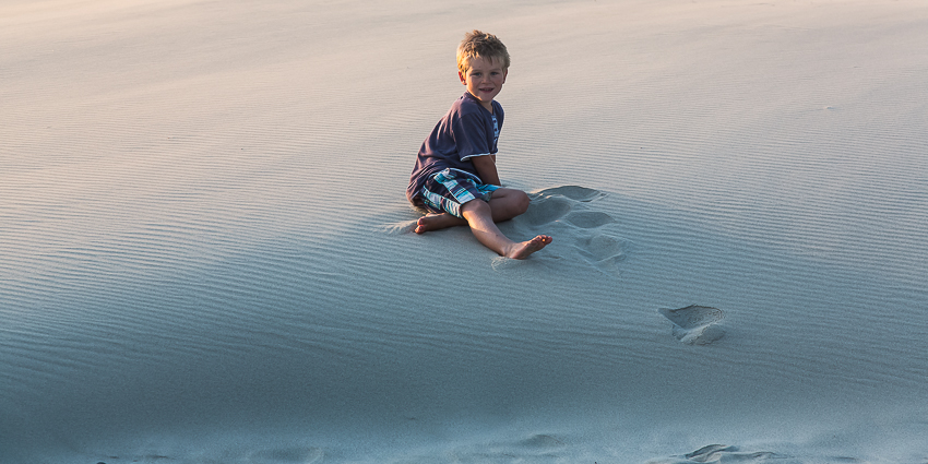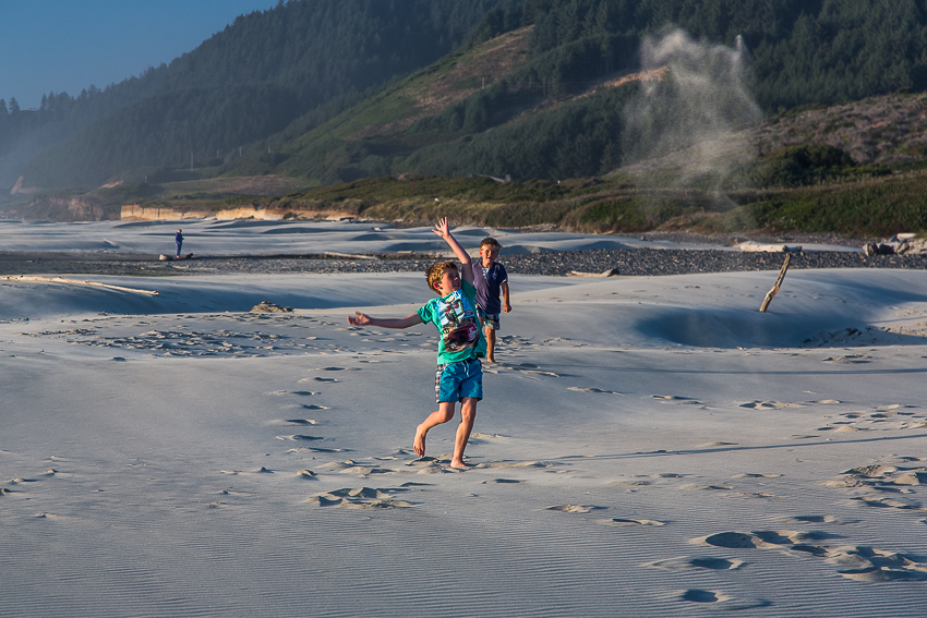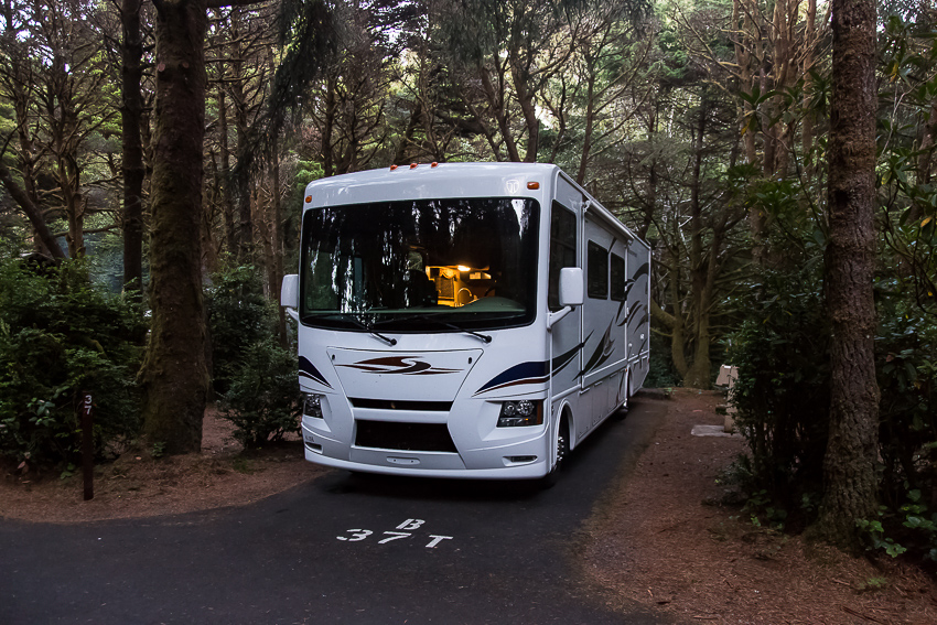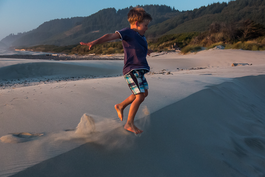 Wir tuckerten also Richtung Süden und ich hatte zwei Übernachtungsplätze im Auge: ein RV Resort in der Nähe von Yachats und den „Carl G. Washburne Memorial SP“. Da wir das Resort in Yachats irgendwie übersehen hatten, fiel uns die Entscheidung es beim State Park zu probieren nicht schwer. Um 18.30 kamen wir dort an. Am Eingang kam uns gleich einer der Hosts entgegengelaufen und erzählte das noch genügend Sites frei wären. Eher beiläufig fragte ich ihn nach Electrical Sites mit 50Amp. „Na klar haben wir die, alle Sites haben 30 und 50Amp.“ Ich konnte es erst gar nicht glauben. Jucchu. Ein wunderschöner State Park MIT 50Amp Stromanschluss. Wir konnten uns irgendeine Site aussuchen und sollten dann das Geld im Kuvert einfach am Eingang in den dafür vorgesehenen Kasten schmeissen. Wir suchten uns mit Site B37T den für unser RV engsten Platz aus. Birgit parkte das Teil rückwärts dann aber wirklich hervorragend ein. Neben dem WoMo hatten wir noch Platz ohne Ende. Mittlerweile war es aber schon kurz vor 19.00. Also wurde das „Andocken“ und bezahlen auf später verschoben und wir liefen die ca. 500 Meter bis zum Strand. Der Weg dorthin war wunderschön und verlief durch eine Mischung aus Regenwald und Zauberwald. Und dann kam der Strand: Wooow, einfach umwerfend schön mit richtigen kleinen Dünen. Die Kinder tobten wie verrückt und für alle war es der bisher schönste Campground im bisherigen Urlaub.