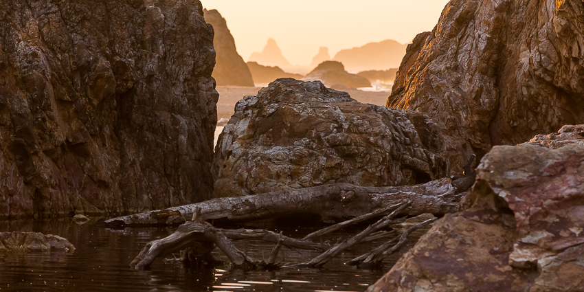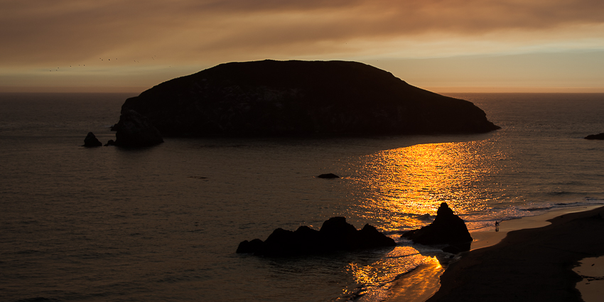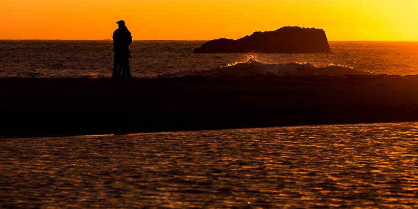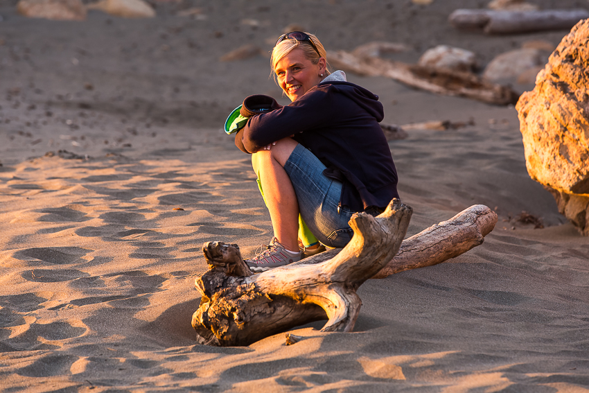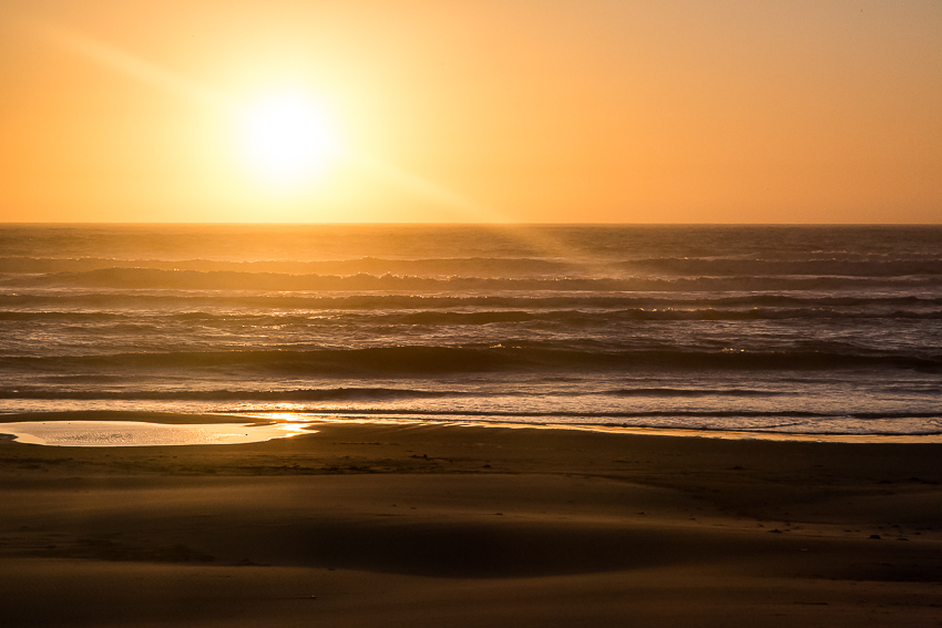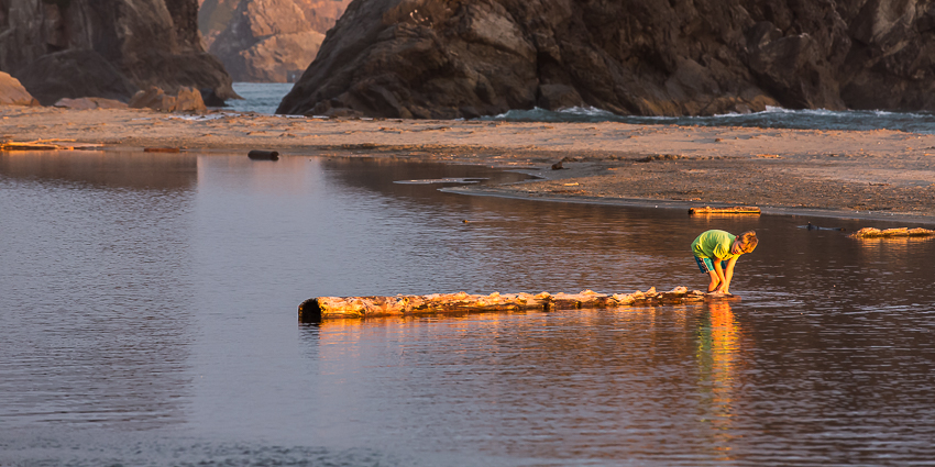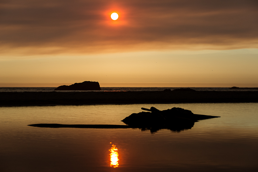 Mit Stellplatz A4 (46’ lang) hatten wir den allerletzten verfügbaren Platz in unsere Größe bekommen. Allerdings nur mit Wasser und 30Amp. Strom hatten wir also nicht, war aber nicht weiter tragisch da ich ja letzte Nacht in unserem „State Park des Jahres“ alles aufgeladen hatte was es zum Aufladen gab. Nachdem das Womo „abgestellt“ war, gingen wir sofort zum Strand runter - pünktlich zum Sonnenuntergang. Dort spielten Tom und Paul noch mit ein paar Baumstämmen in einem dem Meer vorgelagerten Meerwassertümpel, ich schoss noch ein paar schöne Sonnnenuntergangsbilder.